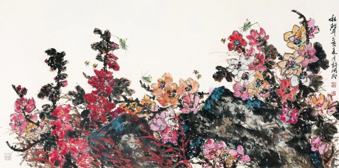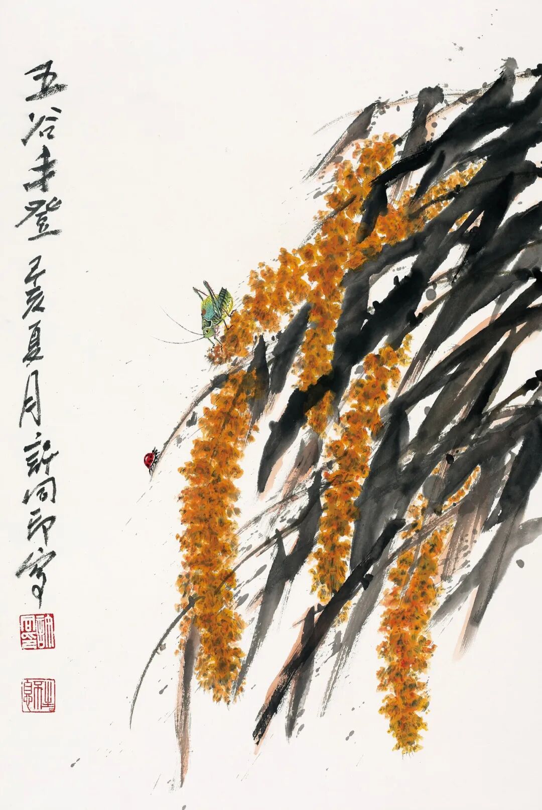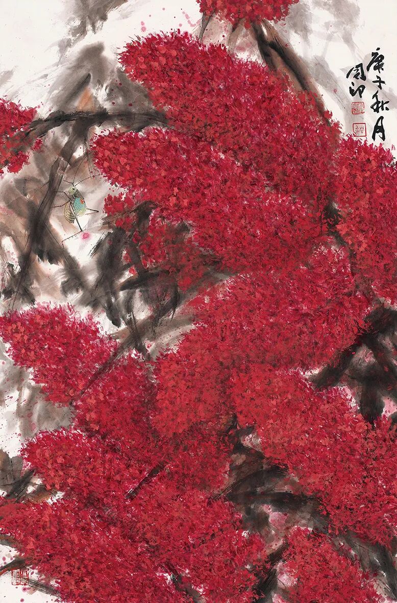 同印原本也是很善能通过把握各审美对象的属性美而赋其不同艺术——审美特征的。如在《五谷丰登》、《秋趣》、《秋声》等作品中,水墨与色彩相映为趣,造型特征妙在能以弧度与敧侧之势表现着变化与统一、整齐与参差的韵律美。