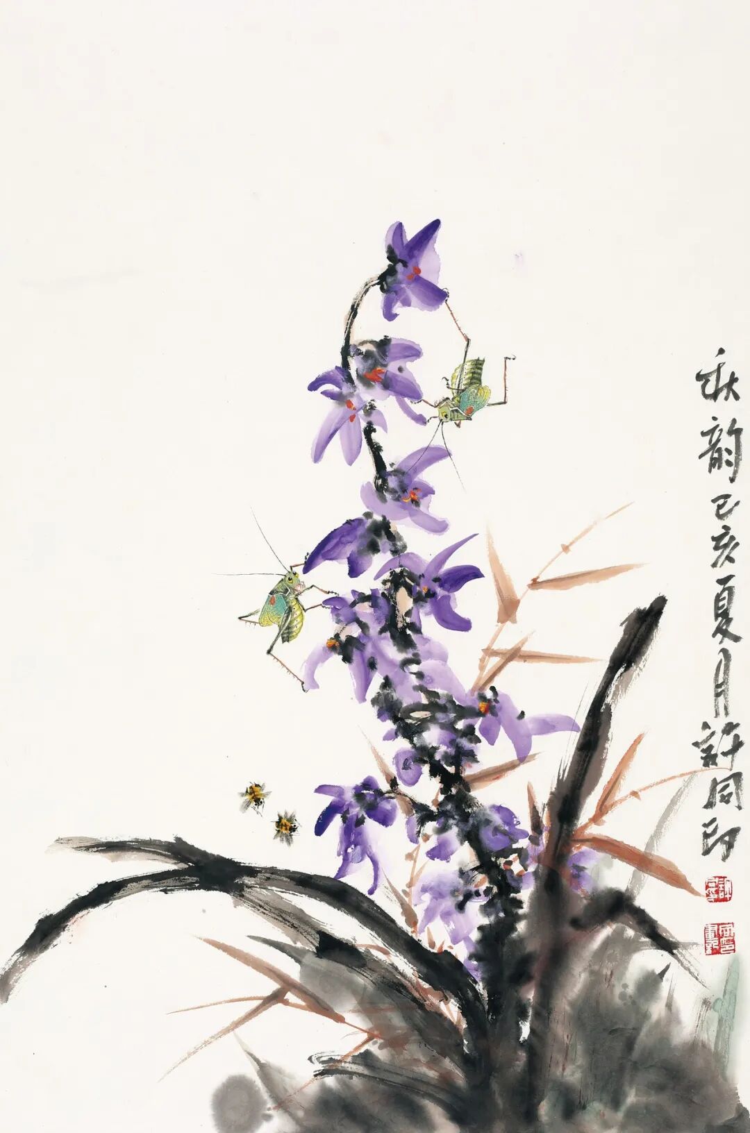 随着创作实践的丰富,和理论修养的提高,同印的审美视野迅速扩大。创作于己亥年(即2019年)的几幅作品,摆脱了小写意画法的拘谨,而放胆纵横,放手挥洒,笔墨随心所欲,任其有定无定,任其有形无形,虚实之间,隐显之间,已是了无挂碍矣。《秋味》中的丝瓜不再是自然地上下垂挂,而是与枝蔓一起横向舞出,占去画面三分之二。丝瓜是绿的,尾端是黄黄的花朵,顶端是多片深浅有别的墨色的叶。鲜明而夺目的审美存在,在来自于画面外强风的摧残下,不规则地扭曲着。那姿态,那创意,实乃是力与速度的旋转与飞扬。很趣,也有一只蝈蝈,悠闲且自得地站在丝瓜的尾部鸣唱着。画家似乎不是在垂怜于作一幅自然事物的谐趣图,硕大的丝瓜更多地是寄托着一种极具开阔性的审美理想。