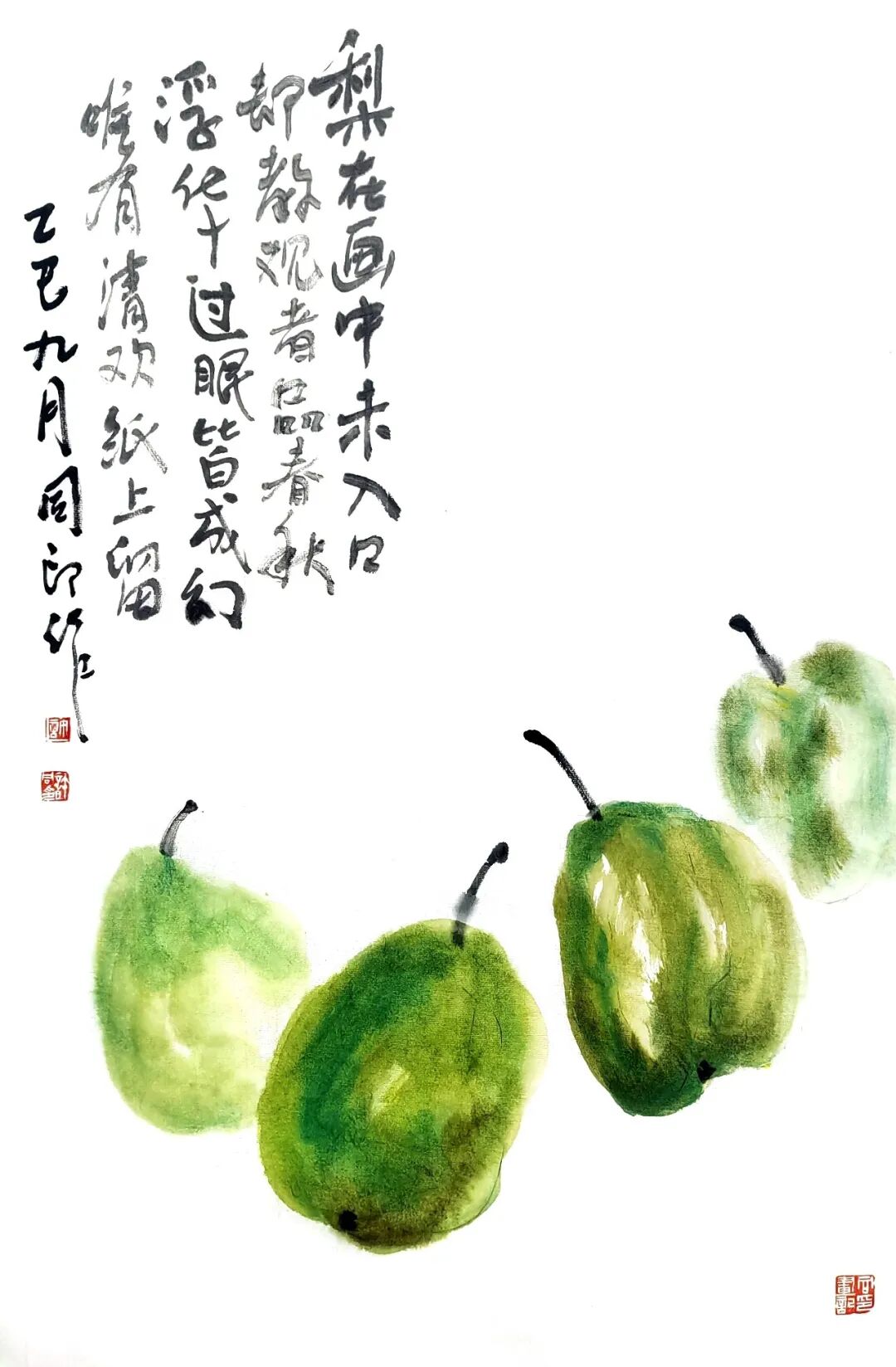 同印的果蔬之作,有多幅专写白菜。白菜之为画题,早已有齐白石的笔意精巧,艺思妙曼而为赏析者心动。同印的白菜之作,如《农家美味》、《清白》等,虽无白石老人的风情,却也是几笔淡墨,几团浓抹,遂使鲜明的造型即刻凸显。且画家又善能于大笔涂抹之余工于细部微意,在率直率意的主体造型架构中,又有意无意于根部小团块墨色中再逸出几许根须,更使白菜造型于朴实中涌动出更加鲜活的生命力。