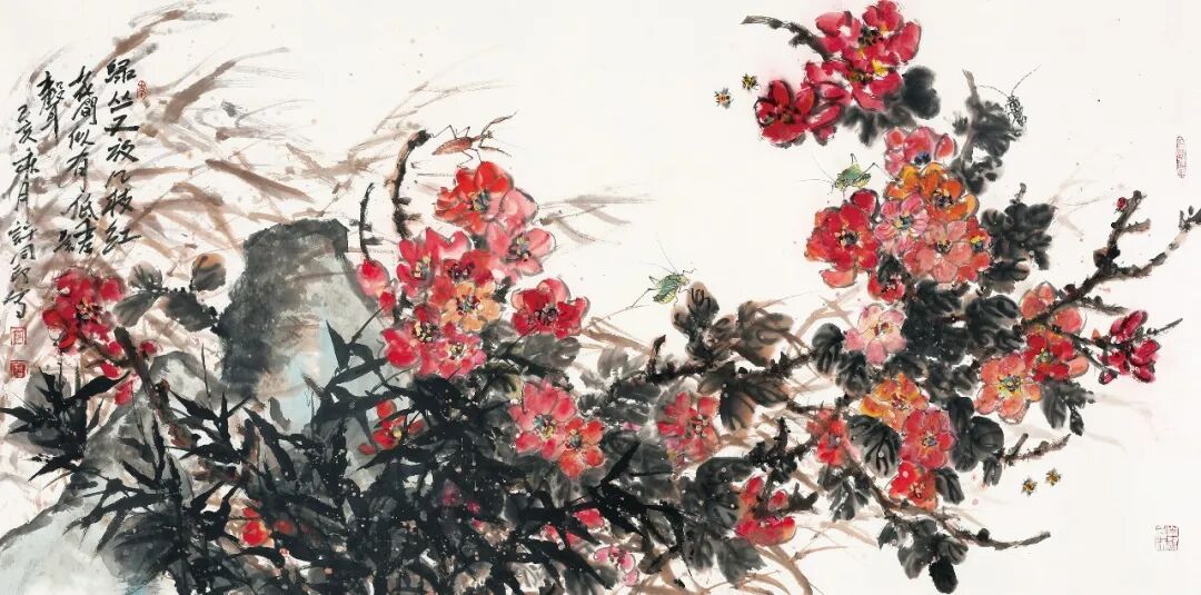 在同印的一系列以花卉为题材的作品中,造成表现对象直观特征的多姿多态的,是本于与作为具体审美对象的自然事物构成必有存在关系的力。画家注意到了这种物外之力的现实性,形象性,并把这种力与自然事物的自然关系升华为艺术表现中的审美关系,这就为他充分展现艺术修养方面的技法与功力提供了机会与可能。如构图上的重叠与交汇,墨色使用上的浓与淡,用笔上的干与湿,傅色上的晕与染,都在这样的物象结构关系中获得了表现的合理性与必要性。