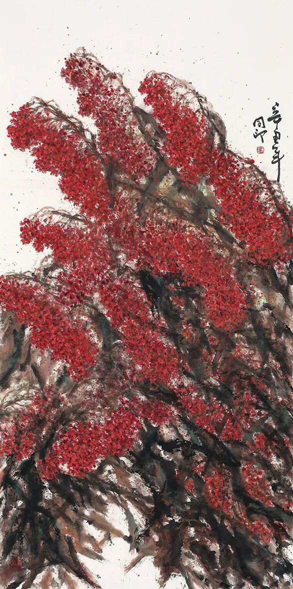 但他确也接受了文人画派的某些审美理想,从而又有意识地认识历史变易中的北派山水审美的时代性,进而赋其应有的时代人文特点,即人与山的亲近,审美主体与审美客体的亲近。其实古代山水画创作早有此一美学观念,黄公望、龚贤等主张写山水要写出宜于“人居”之处,就是这个意思。同印的作品强化了这一认识,以红色点染、点缀山之秋色,以较强的也是较大面积的光的存在,和审美审视中山体衔接与山势转换处的奇妙诡异变化寄予存在的不可测定性,都为想象与联想留下了足够的审美空间。这应该是同印山水画创作的艺术——审美探索之一。