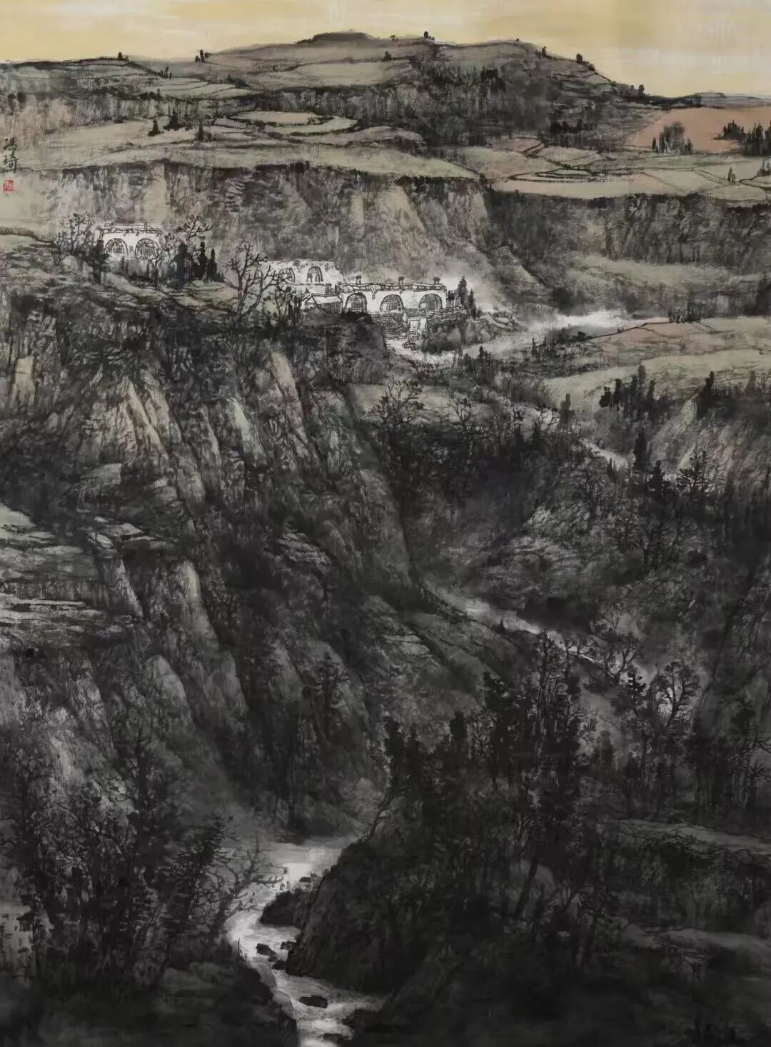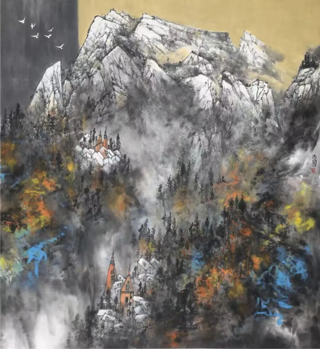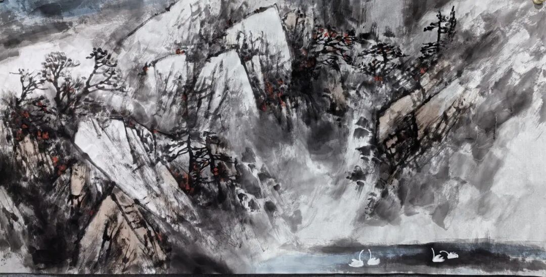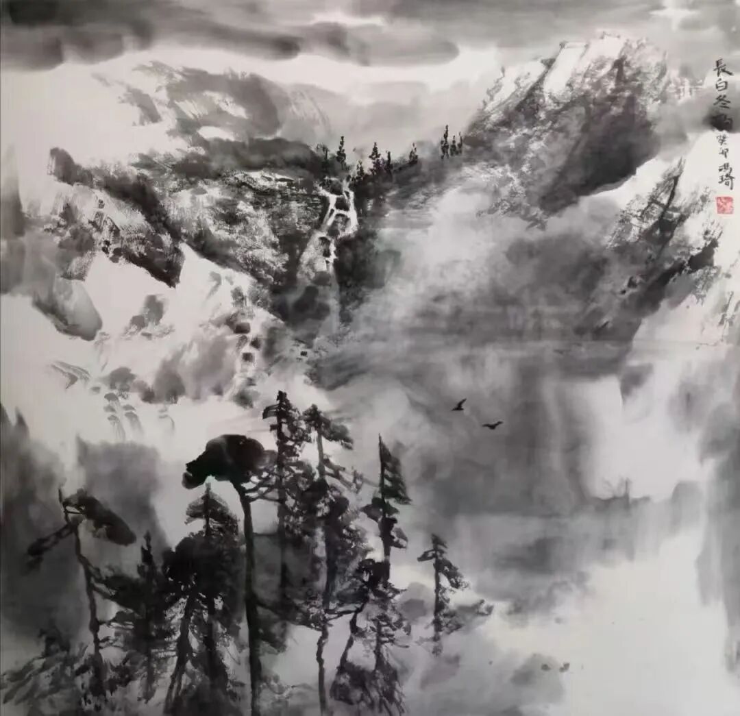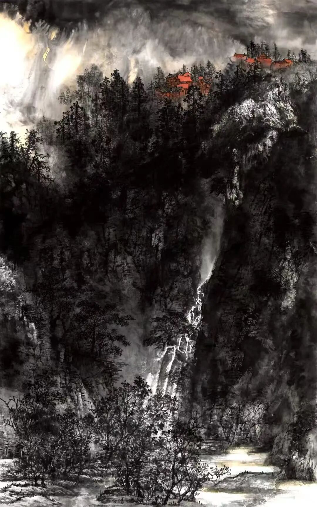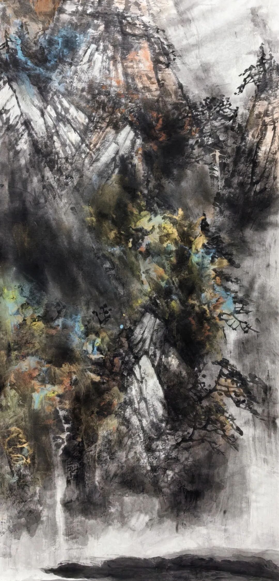 当代艺术家冯琦以写意山水取胜,她对墨色运用自如,墨汁浓淡相间,勾勒出山峦起伏、江河蜿蜒的景象,表现出山水的壮丽气势和灵动韵味。她的写意山水,有的墨意浓重,有的淡墨轻染,多以简练、概括的手法勾勒出山川的轮廓和水流的起伏,使整幅画面呈现出层次分明、起伏跌宕的景象,并在干湿浓淡之间,呈现丰富多彩的视觉效果。水是山的脉络,流转而生的是充满生命力的蓬勃生机,在冯琦的山水画中,水流贯穿其间,串联起整幅画面的气韵走势,也使静止的画面因脉脉流动的涓涓水流而形成寓静以动的效果,水吟更显山幽,从而将视觉、听觉相关联,更深刻的体验山水意境。冯琦笔下的江南景色就呈现出一派雾霭茫茫,烟雨如织的诗情画意,她将墨色揉进远山,注入山河,在疏密的皴法和润泽的技法渲染下,写出秀美的自然景色,安然的乐居景象,画面喷薄而出含蓄生动的雨润江南。淋漓墨韵的写意山水画,不仅表现出自然山水的壮美和神秘,更展现了艺术家冯琦的墨韵功力和对自然景观的深刻理解,走进冯琦的笔墨世界,感受大自然的奇妙和艺术家内心的情感表达,令人心旷神怡,留连忘返。
