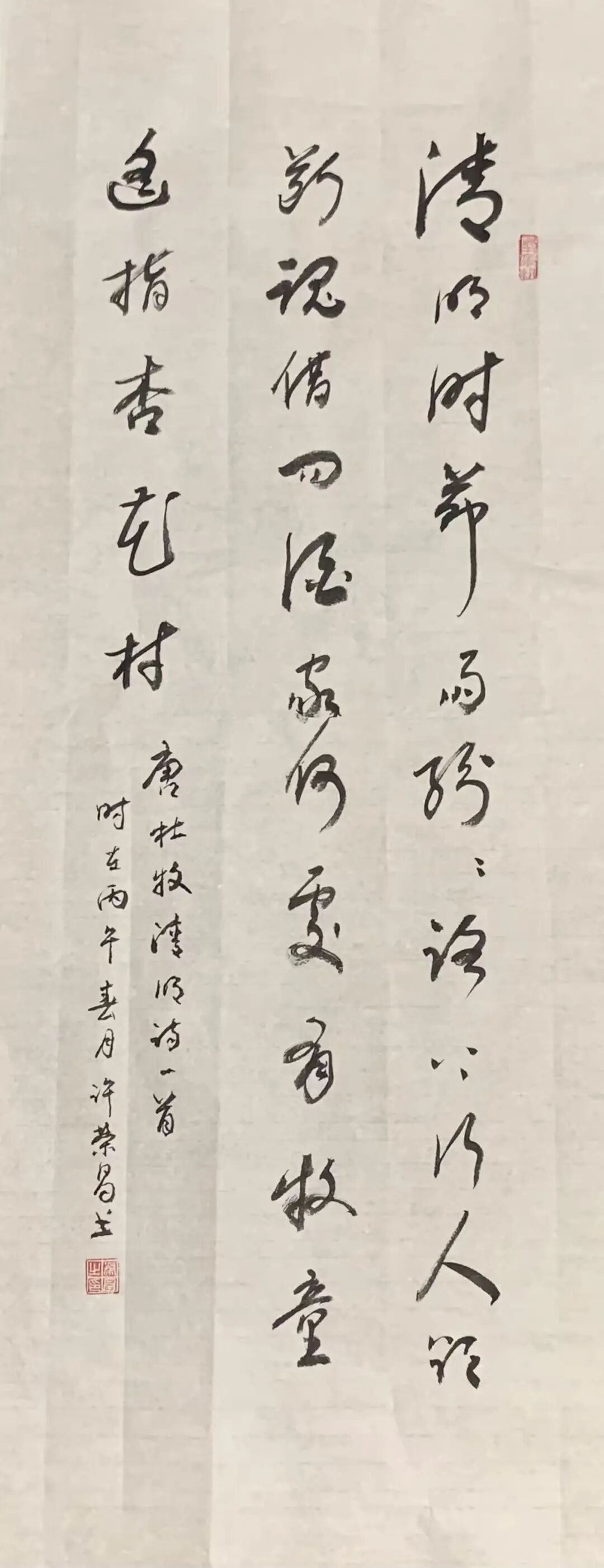 许荣昌从小一直酷爱书法,可在任职期间很少有时间学习和研究书法,但追求学习书法的梦想却始终没有放弃。他在工作之余痴迷书法艺术,特别是在2002年退休后,尽管患上了帕金森疾病,严重时右手颤抖不能自主活动,但凭着对书法艺术的执着,不愿放下手中的毛笔,以惊人的毅力克服种种困难天天坚持写字临帖。凡是见过他书法作品的人,都很难相信这是出自年近古稀且患有严重帕金森疾病人之手。