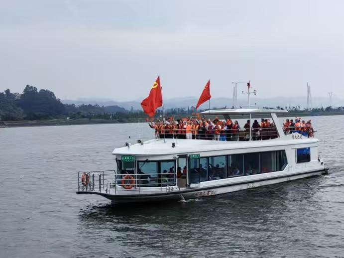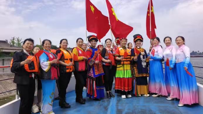 午餐时分,江湾神木园备下暖心佳肴,席间笑语晏晏。午后时光格外惬意,姐妹们换上崭新民族盛装,登游轮畅游青神湖。碧水荡漾中,游船缓行,彝汉藏各族儿女的情谊在船舱汇聚,红旗与彩衣共舞,《歌唱祖国》的旋律与湖水拍岸声交织成歌。无人机掠影湖面,将这民族团结的画卷定格——水天一色间,歌声与欢笑相融,两岸青山逶迤,恰是中华民族共同体的生动写照。