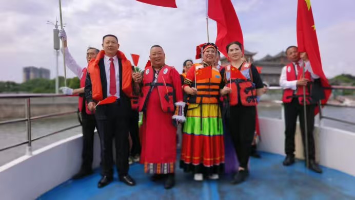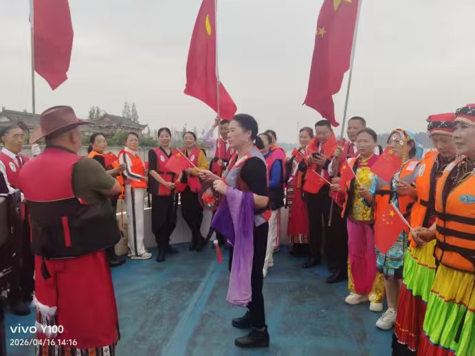 夕阳为青神湖镀上金边,游轮缓缓靠岸。众人执手相看,在岸边定格笑颜:华服映青山,旗韵融春水,每一张照片都是民族情深的见证,每双眼眸都闪耀着同舟共济的星光。