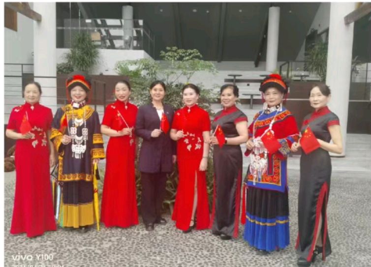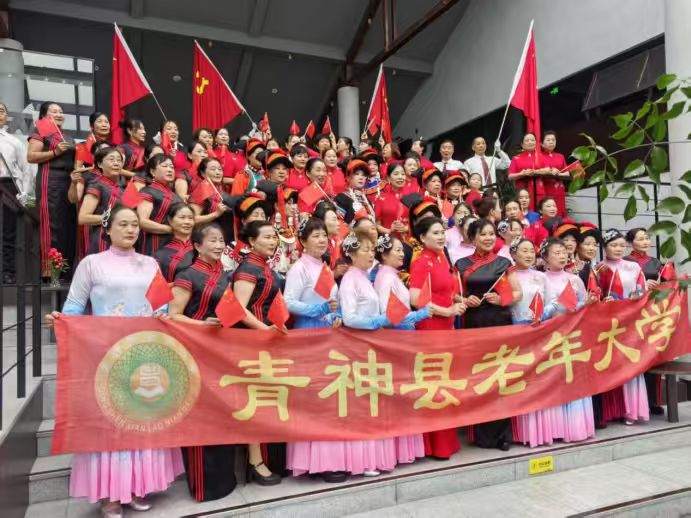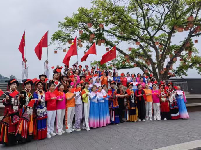 走秀落幕,老河街大榕树下,党旗国旗猎猎飘扬。姐妹们手挽手围成同心圆,齐声高唱《歌唱祖国》。熟悉旋律里,彝语的悠扬、汉语的深情、藏语的豪迈融于一炉,歌声穿透云霄,在青神大地激荡——这是跨越民族的共鸣,是对祖国母亲最赤诚的告白。