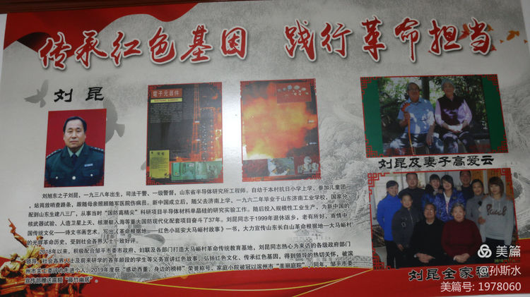 刘旭东之子刘昆,一九三八年出生,司法干警,一级警督,山东省半导体研究所工程师。自幼于本村抗日小学上学,参加儿童团,站岗放哨查路条,跟随母亲照顾随军医院伤病员。新中国成立后,随父去济南上学,一九六二年毕业于山东济南工业学校,国家分配到山东生建八三厂,从事当时"国防高精尖"科研项目半导体材料单晶硅的研究实验工作。随后投入规模性工业生产,为新中国的核武器试验,人造卫星上天,核潜艇入海等重大国防现代化配套项目奋斗了37年。刘昆同志于1999年退休返乡,老有所好,寄情中国传统文化诗文书画艺术。写出《革命根据地红色小延安大马峪村故事》一书,大力宣传山东长白山革命根据地一大马峪村的光辉革命历史,受到社会各界人士一致好评。
