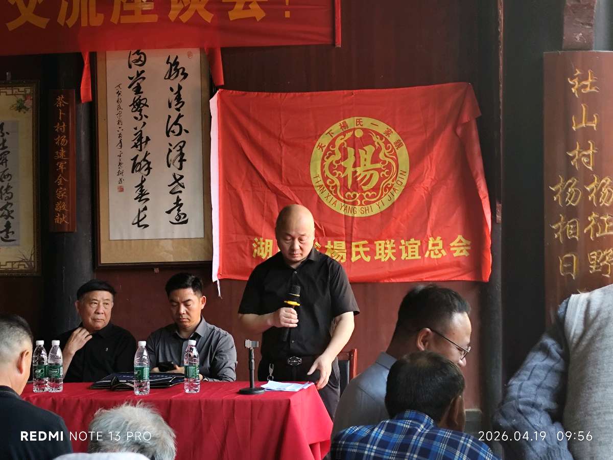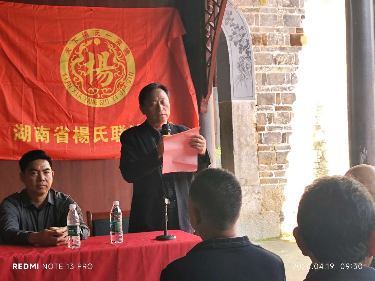 4月18日,湖南杨氏族务委员会筹备组第一次会议在洞口县维也纳酒店举行,来自全省各地的杨氏宗亲负责人齐聚一堂,共商杨氏文化传承与发展大计。次日,与会代表前往全国重点文物保护单位——曲塘杨氏宗祠,召开宗亲联谊会并参观学习。