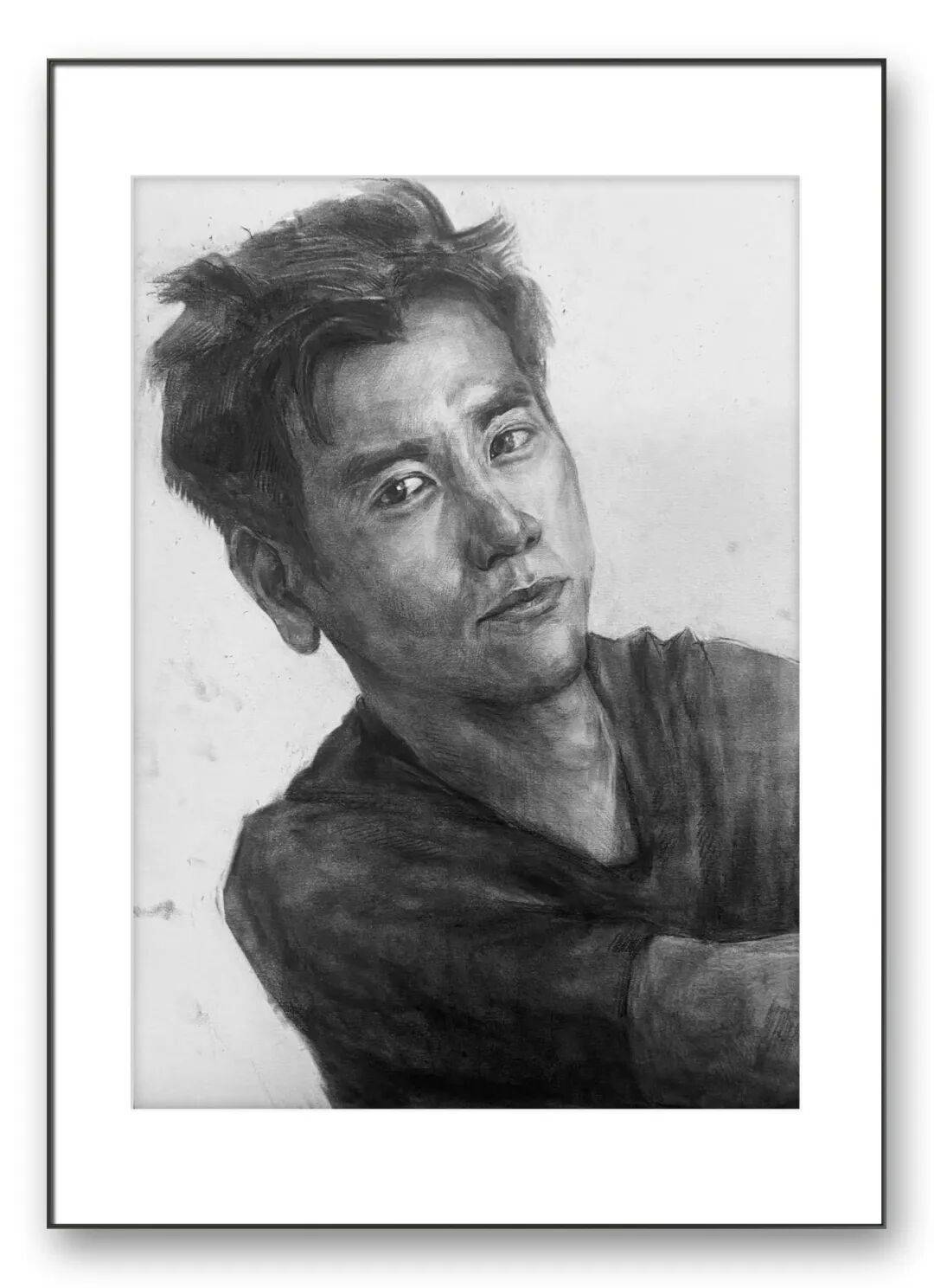 在素描创作中,周俊明老师展现了扎实的造型功底与细腻的光影把控能力。静物素描里,金属水壶的冷冽反光、玻璃瓶的通透质感、大蒜与衬布的柔软褶皱,都在黑白灰的层次中被精准还原。他对明暗交界线的处理尤为精妙,从高光到投影的过渡自然柔和,让静态的器物拥有了呼吸般的质感。人物肖像素描则更见功力,画面中的男子眼神清澈而坚定,面部结构的塑造摒弃了刻板的轮廓线,而是通过光影的微妙变化,让颧骨、眉骨、下颌骨的转折自然衔接,头发的蓬松感、衣物的褶皱层次,都在炭笔的轻重顿挫间被刻画得淋漓尽致,寥寥数笔便抓住了人物的神态与气质,尽显写实素描的魅力。