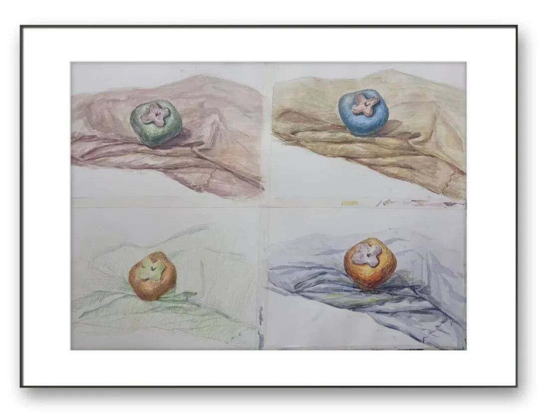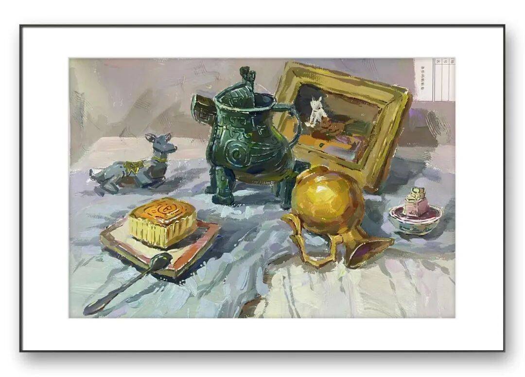 色彩创作中,周俊明老师同样展现了不俗的表现力。色彩静物里,青铜鼎的厚重绿锈、月饼的暖黄光泽、金色器皿的金属质感,在和谐的色调中被表现得层次分明。他擅长用色彩的冷暖对比塑造物体体积,衬布的冷灰底色与器物的暖色调形成呼应,背景的虚化处理则让主体更加突出。而画室场景的水彩作品,则用通透的色彩捕捉了光影的流动感,画室里的人物、画架、物品在柔和的光影中呈现出朦胧的氛围感,水彩的晕染特性被发挥得恰到好处,淡紫与浅蓝的色调营造出安静而专注的创作氛围,让观者仿佛置身于画室之中,感受到艺术创作的静谧与美好。