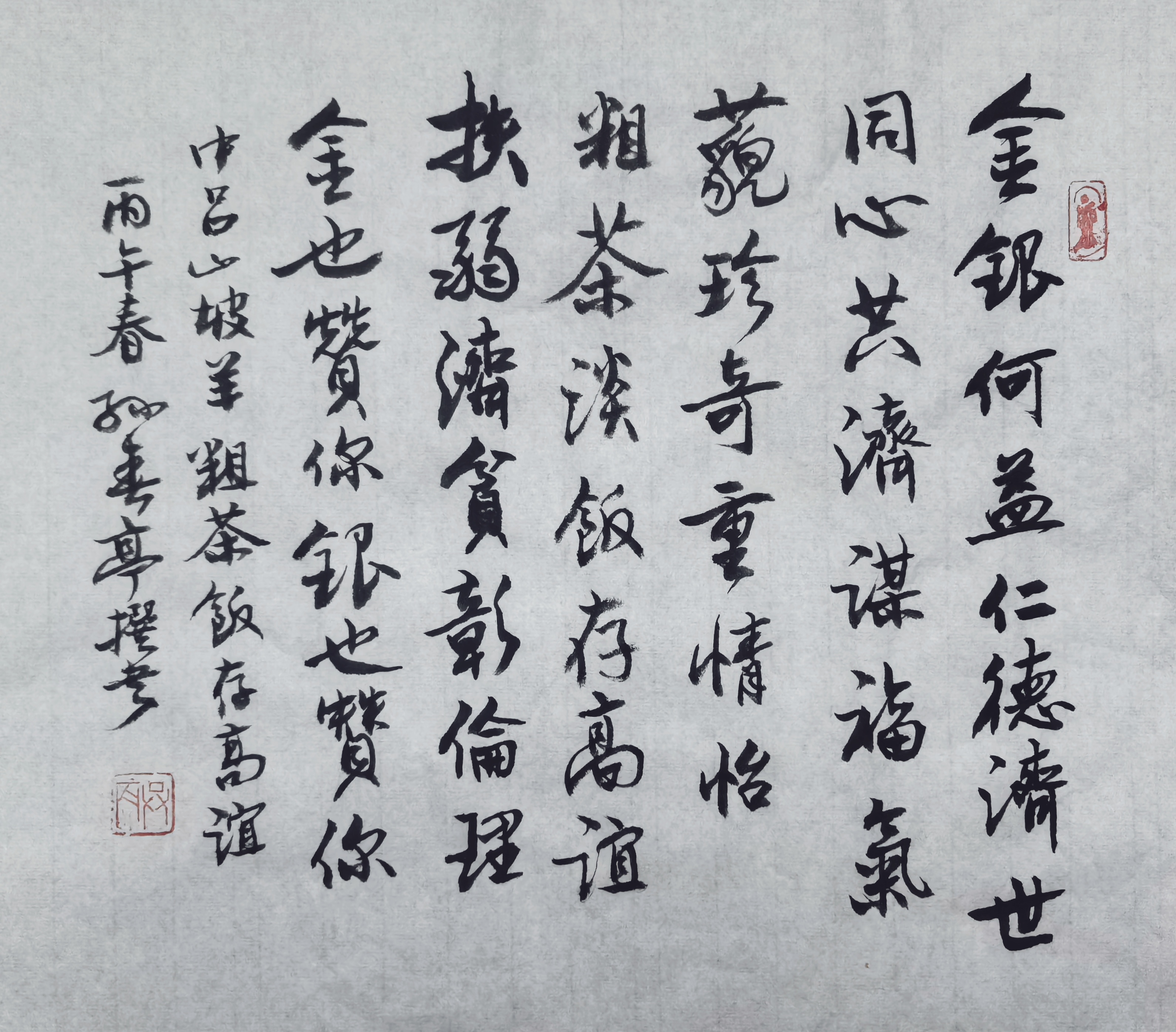 金银何益?仁德济世。同心共济谋福气。藐珍奇,重情怡。粗茶淡饭存高谊,扶弱济贫彰伦理。金,也赞你;银,也赞你。