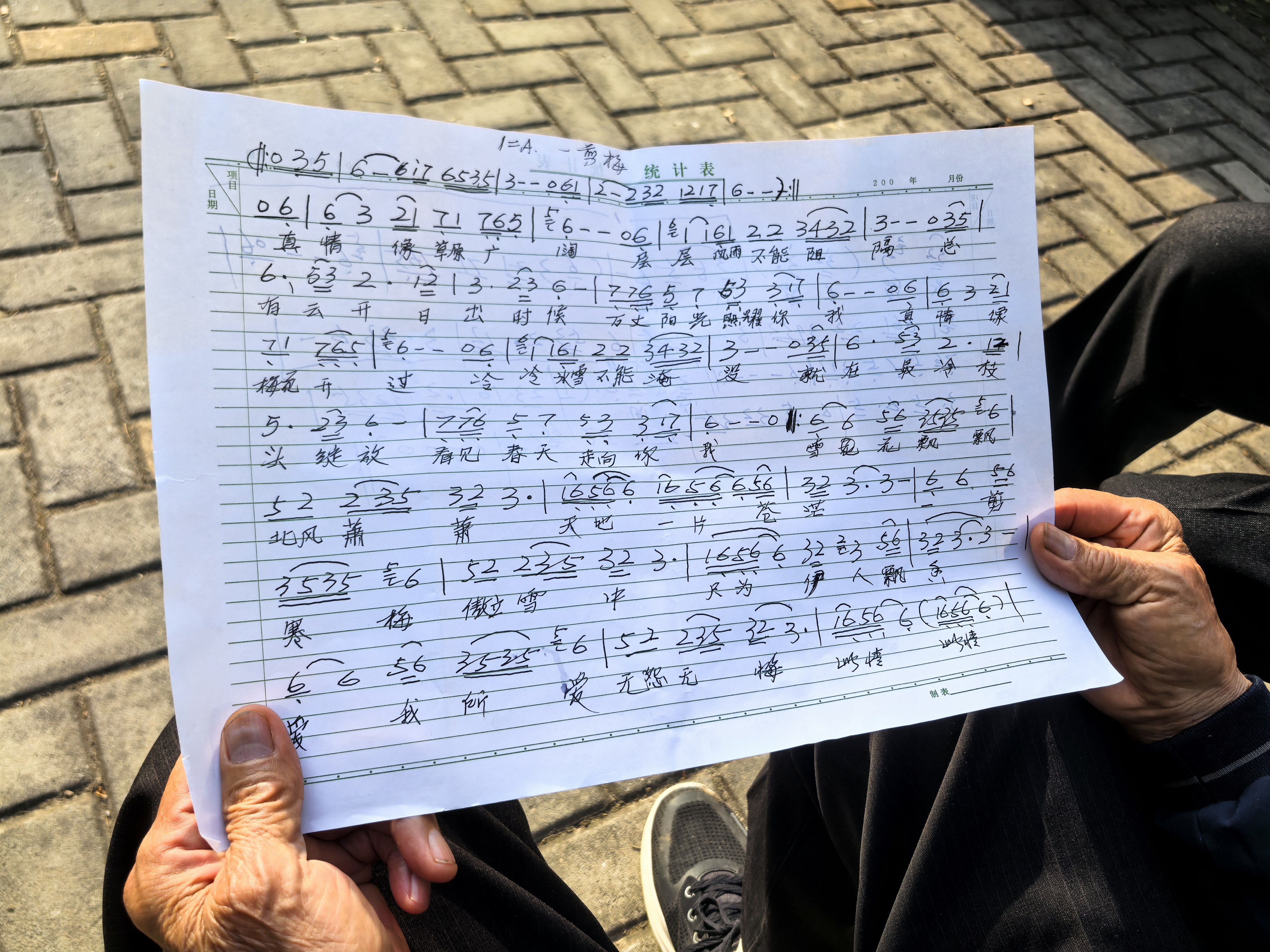 临走时,我征得他们同意,拍下了他们手里的曲谱,又给他们照了一张合影。老太太把曲谱递过来让我看,是两张普通的纸,上面用钢笔抄着谱子和词,字迹工工整整的。老太太说,这都是老伴自己写的。我仔细看了看,那字一笔一划,写得认真,没有潦草,像是用了一辈子的耐心。