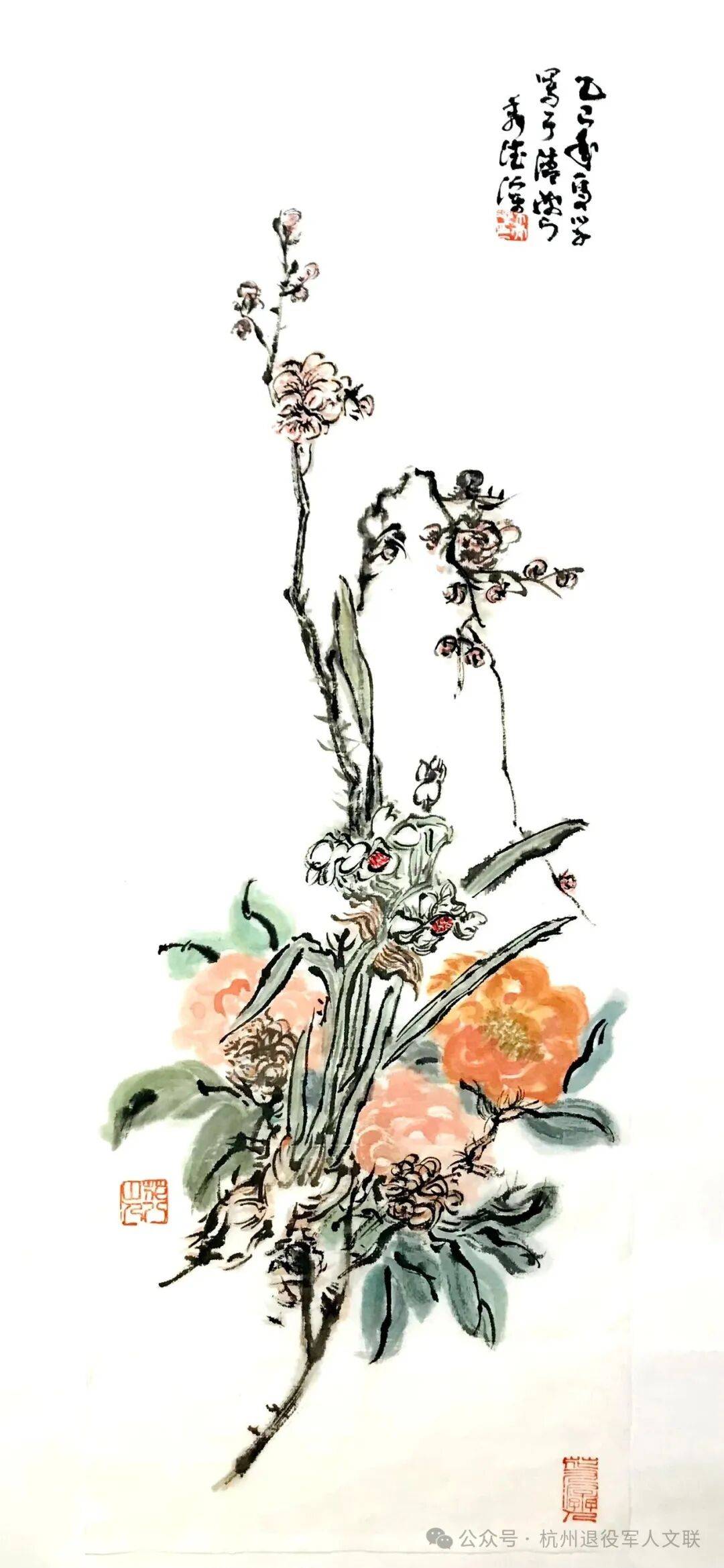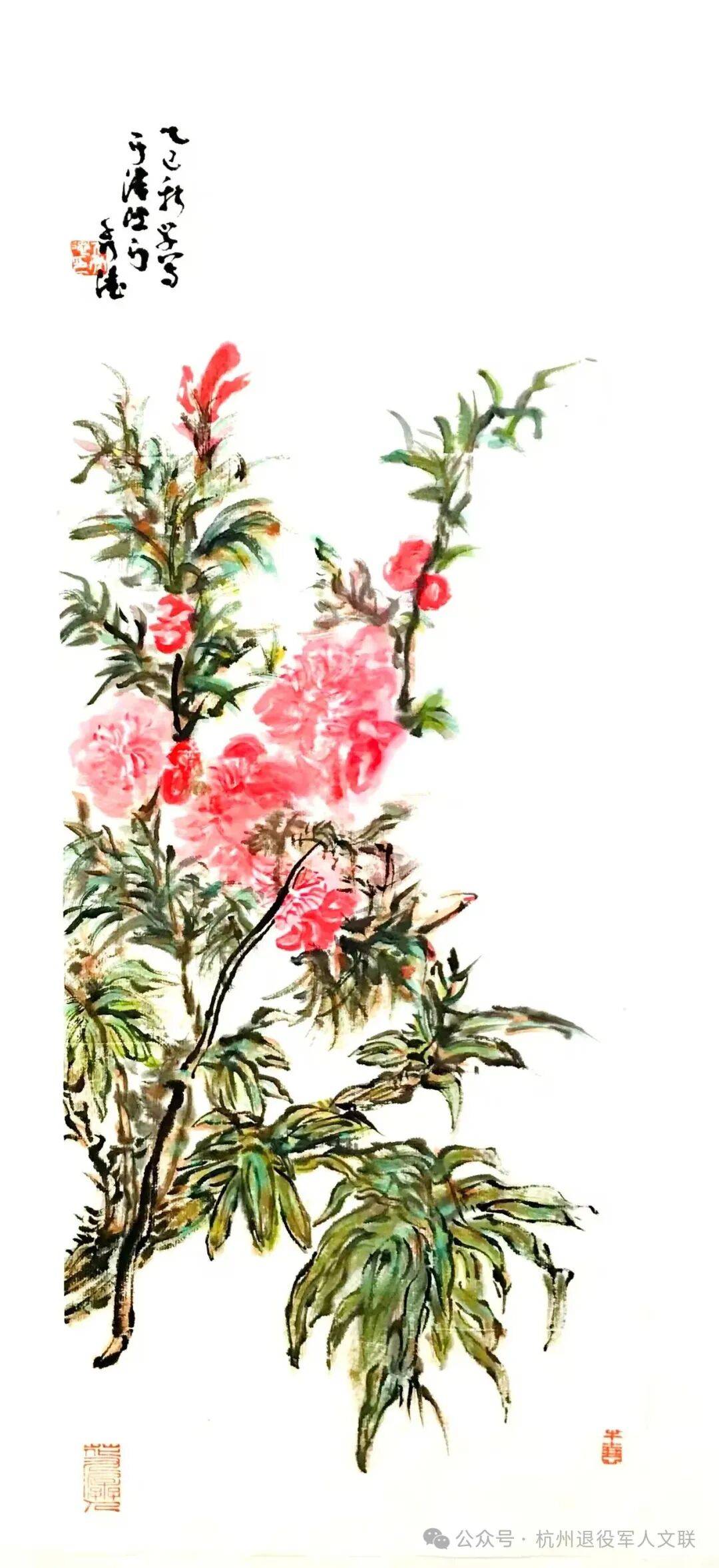 朱秘书长的画,完美的展现了黄宾虹的笔墨根基,始终锚定在“以书入画”的传统脉络里。花卉作品中,石榴花枝以焦墨枯笔写就,线条如篆隶般苍劲涩重,似老藤盘曲却暗藏弹性;花瓣则以淡胭脂点染,水色与墨气交融处晕出朦胧意态,柔媚中见筋骨。这种“刚笔写枝、柔笔绘花”的反差,恰是其“五笔法”中“重”与“变”的精妙实践——枝叶的“屋漏痕”笔法筑牢骨架,花团的“破墨法”赋予生机,让寻常花鸟跳出了纤柔甜俗的窠臼。