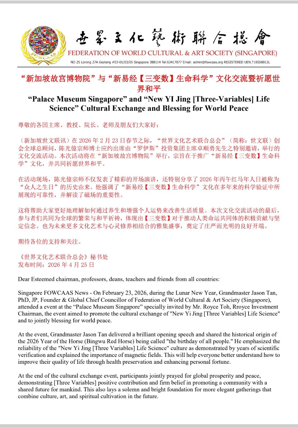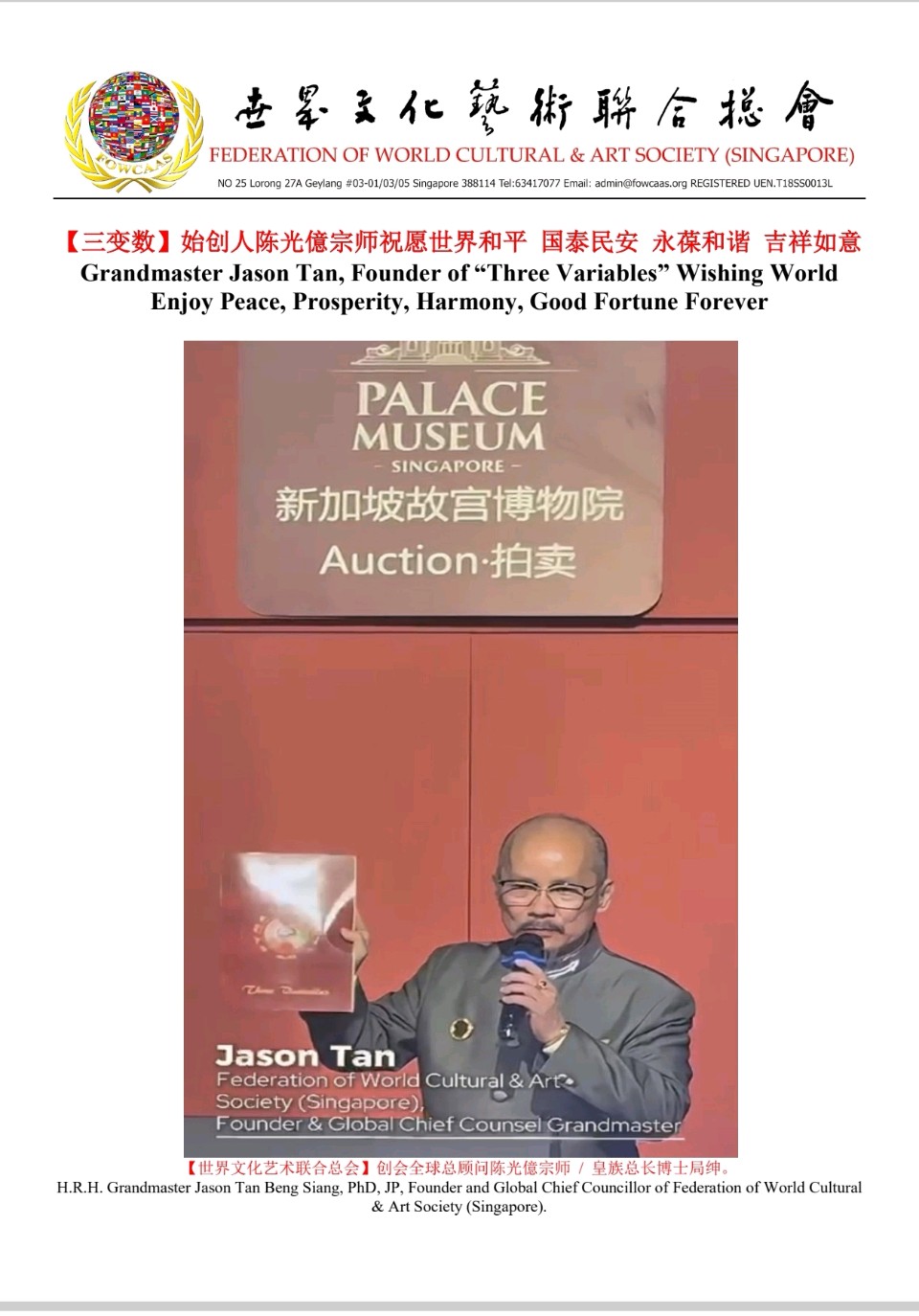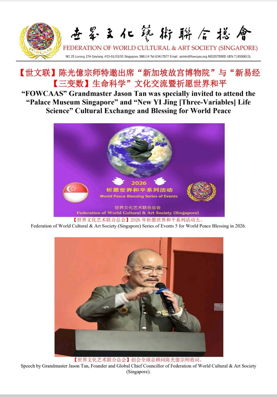 【世文联】陈光億宗师特邀出席“新加坡故宫博物院”与“新易经【三变数】生命科学”文化交流暨祈愿世界和平