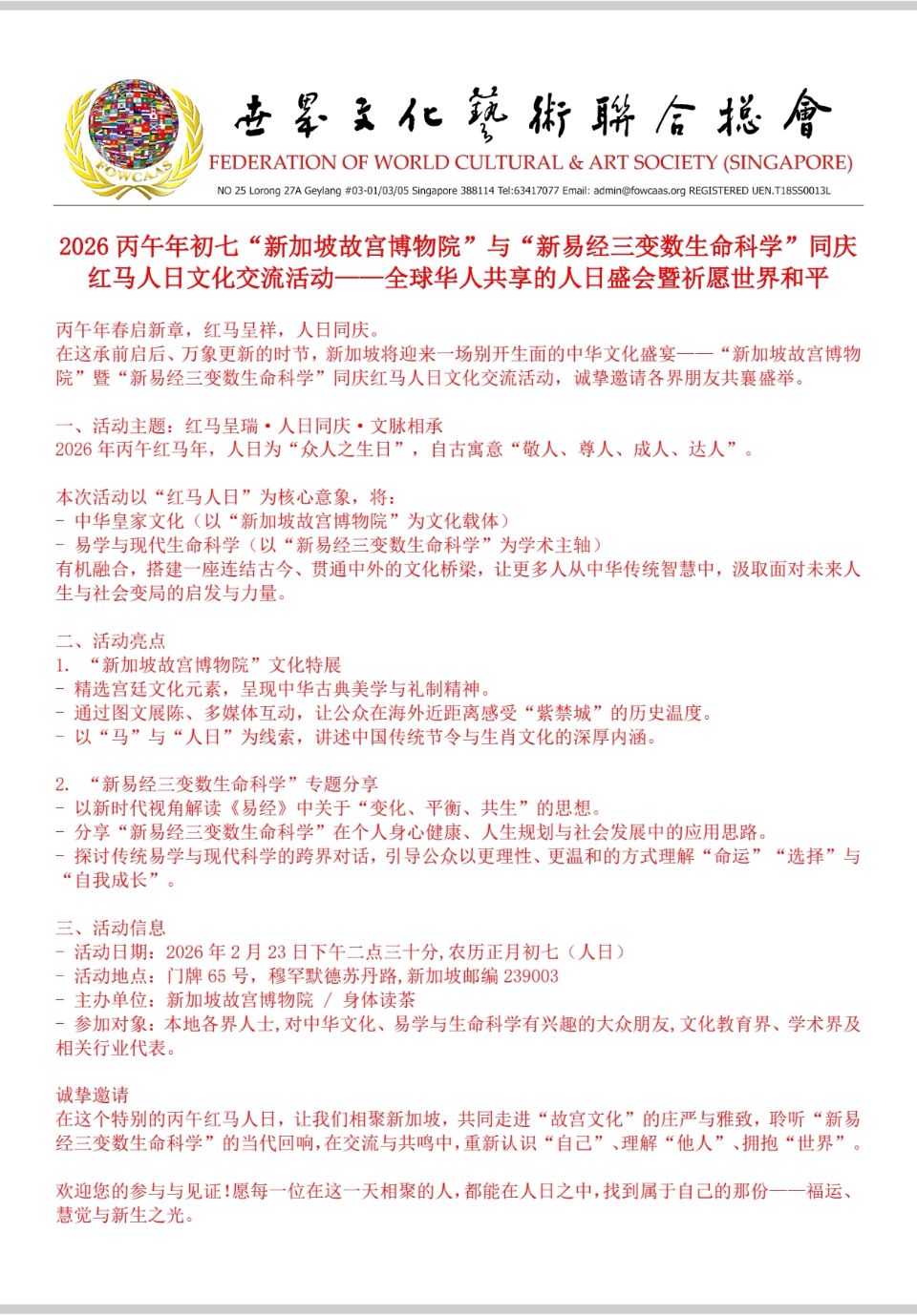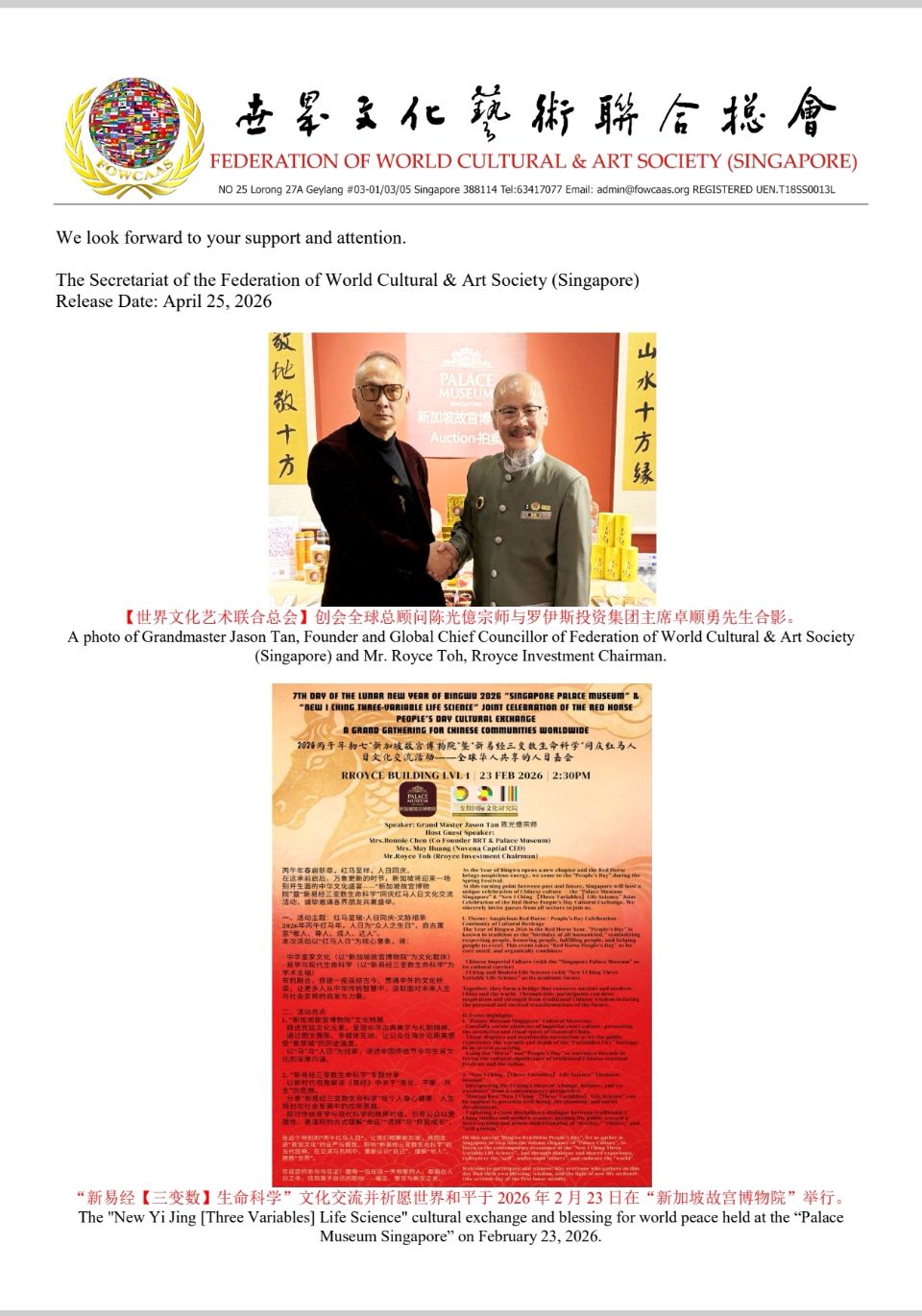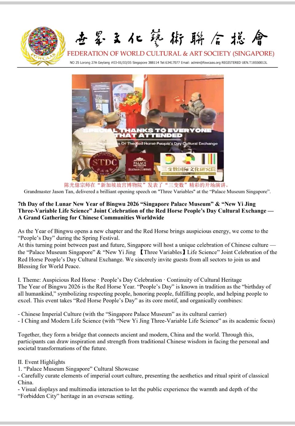 【世文联】陈光億宗师特邀出席“新加坡故宫博物院”与“新易经【三变数】生命科学”文化交流暨祈愿世界和平