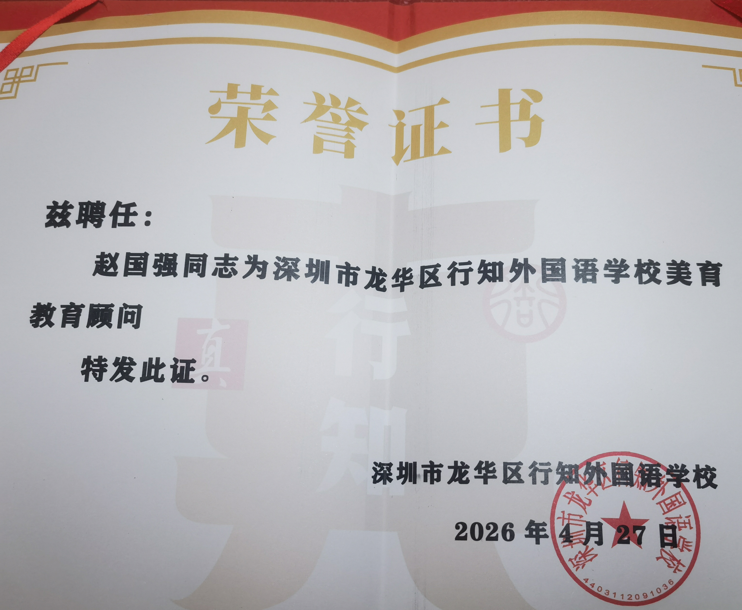 4月27日,国家一级演员、著名男高音歌唱家赵国强受聘为深圳市龙华区行知外国语学校美育教育顾问。