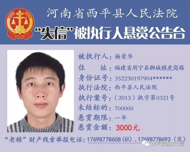 本院在执行案件过程中,因下列被执行人不履行生效法律文书所确定的义务、故意隐匿财产躲避执行,特对以下被执行人进行悬赏执行,并承诺有关人员如提供真实有效的被执行人下落并协助抓获, 向其支付赏金3000元。
