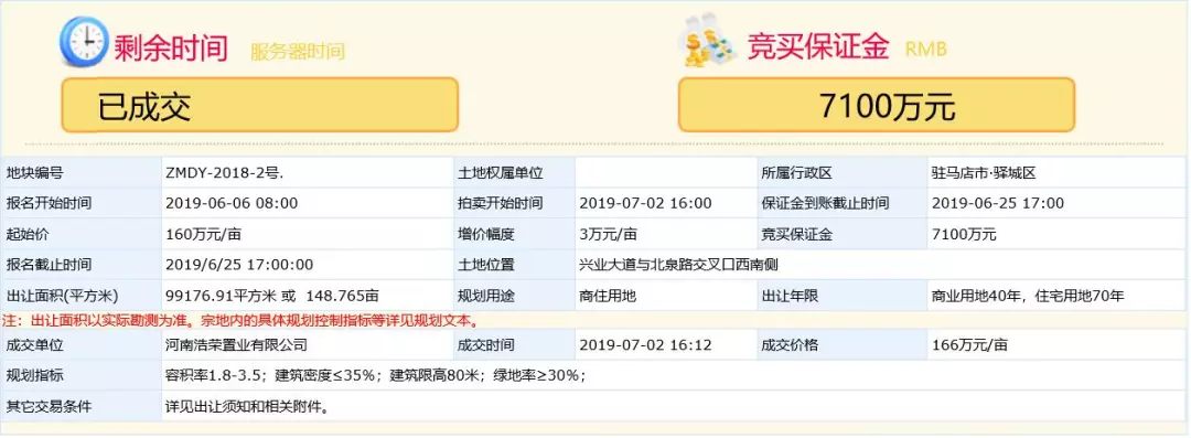 宗地三:ZMDY-2018-2号地块被河南浩荣置业有限公司以711.45元/㎡的住宅楼面价竞得,总价2.47亿元,单价166万/亩。