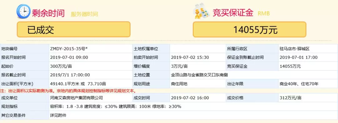 2019年7月2日,驻马店市地产交易中心传来新地王ZMDSF-2018-17号宗地的拍卖消息。