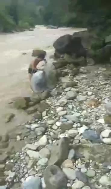 夫妻过河正涨洪,可女淌水不会泳