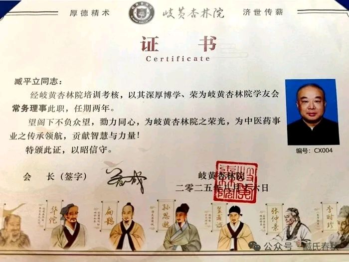 臧平立受聘岐黄杏林院学友会常务理事