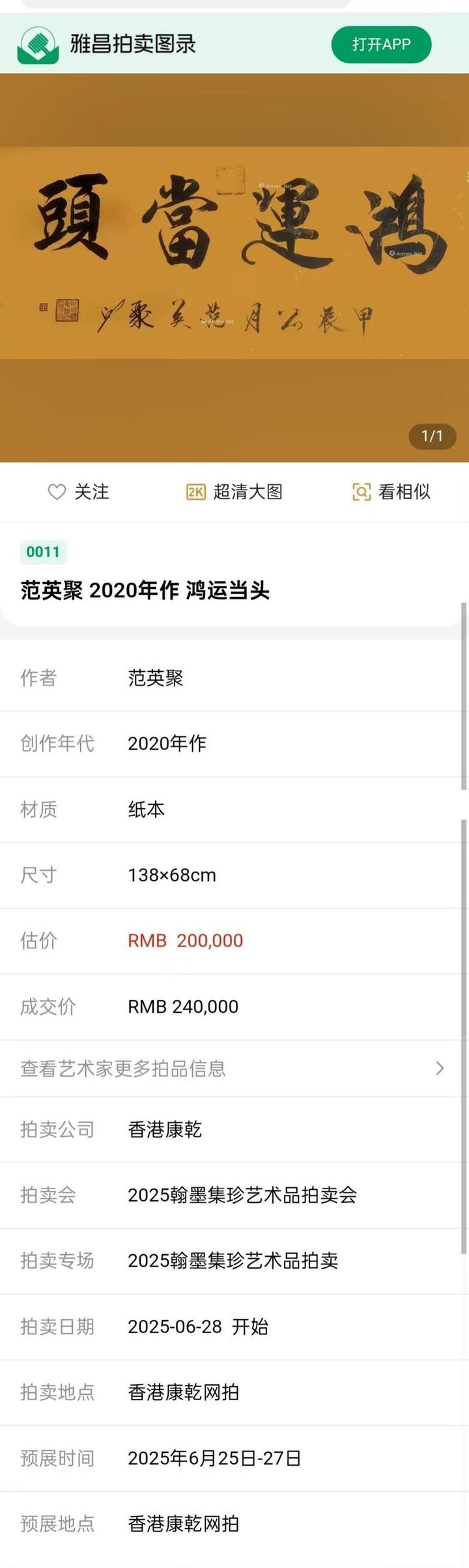 串城体书法家范英聚作品《鸿运当头》在香港康乾拍卖成交功