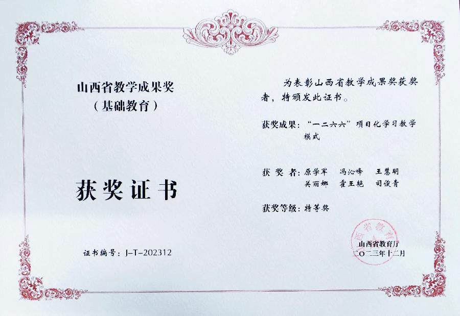 特大喜讯:晋城三中原学军校长主持研究的《1266项目化学习教学模式》获山西省教学成果特等奖