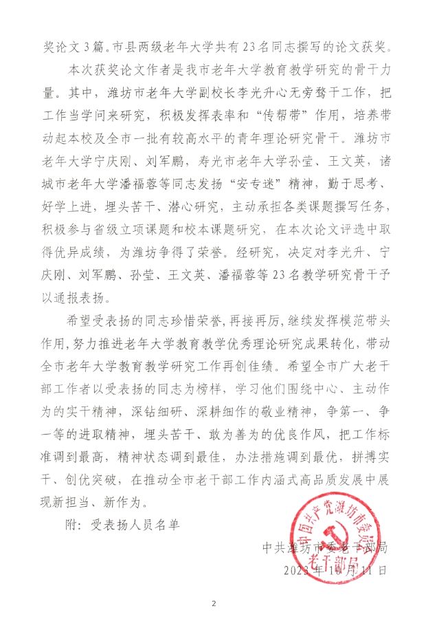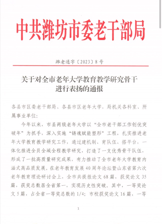 关于全市老年大学教育教学研究进行表扬的通报