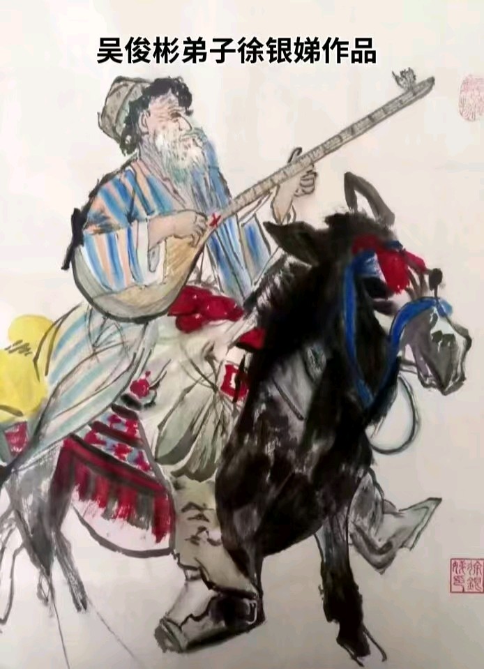 《弹起热瓦普》黄胄再传弟子徐银娣(上海)作品展【中国书画】徐银娣拜吴俊彬为师,擅长画骆驼、画驴,上海吴门八雅书画院院长。上海十大书画名家之一。