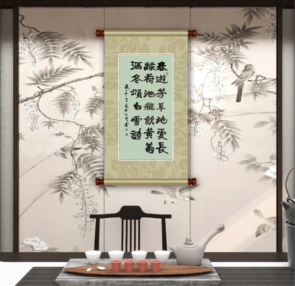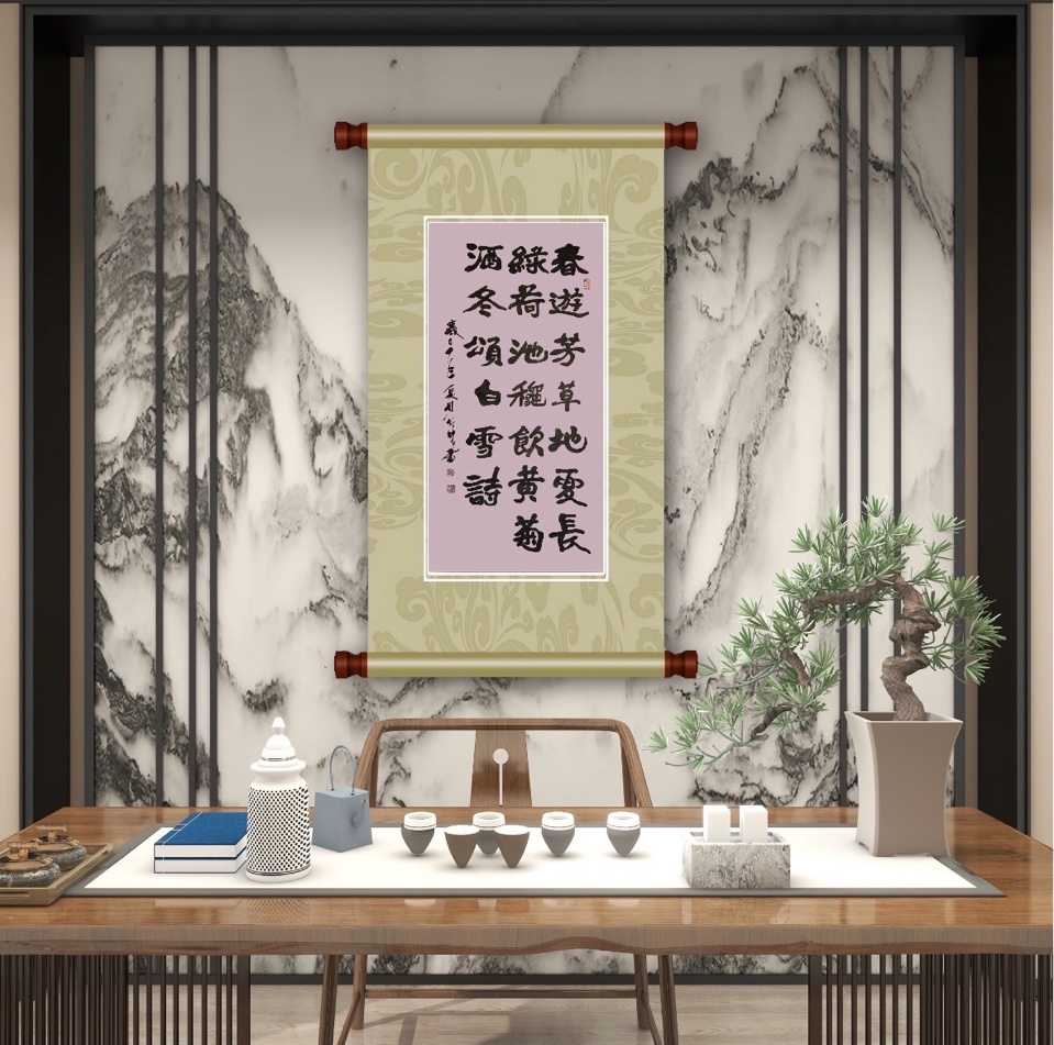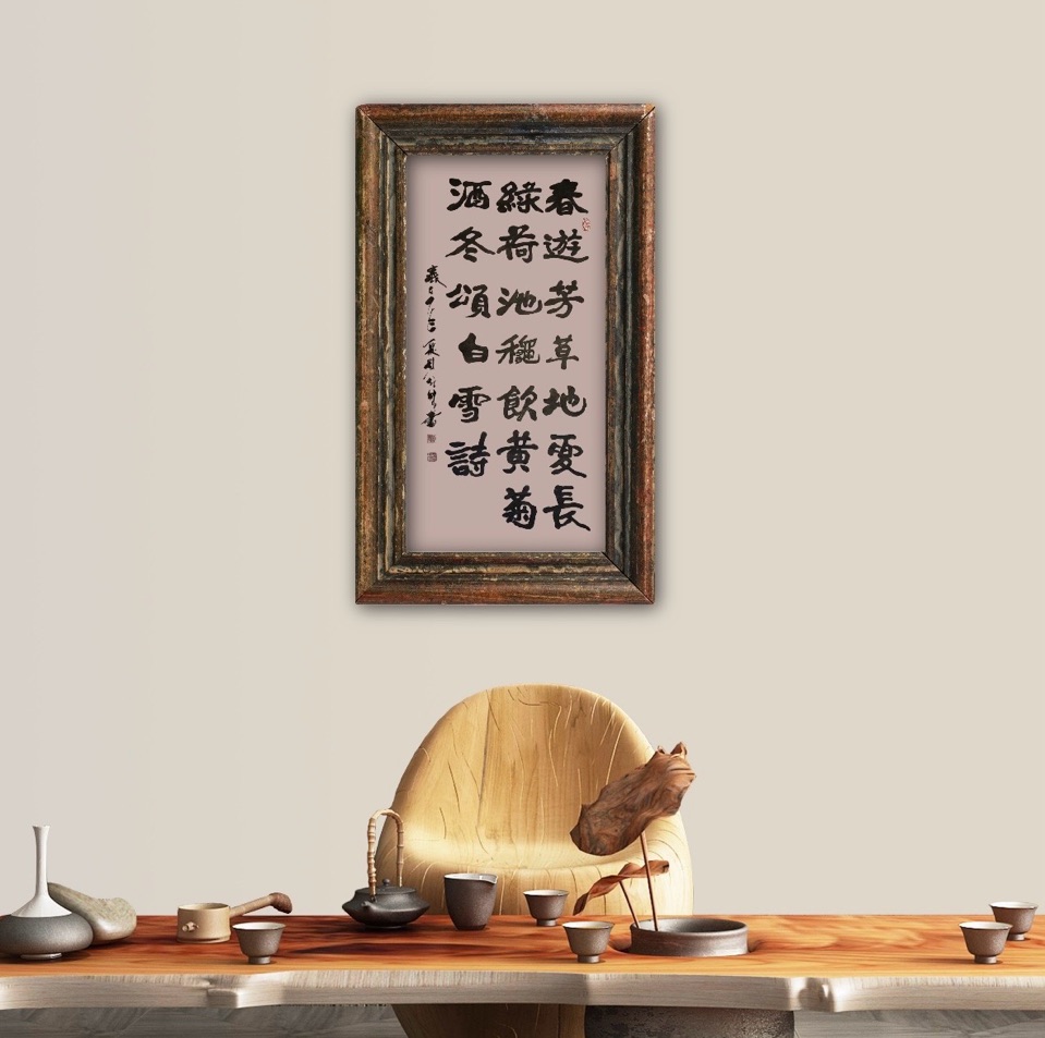 竖幅书法: 春游芳草地,夏赏绿荷池;秋饮黄花酒,冬吟白雪诗。