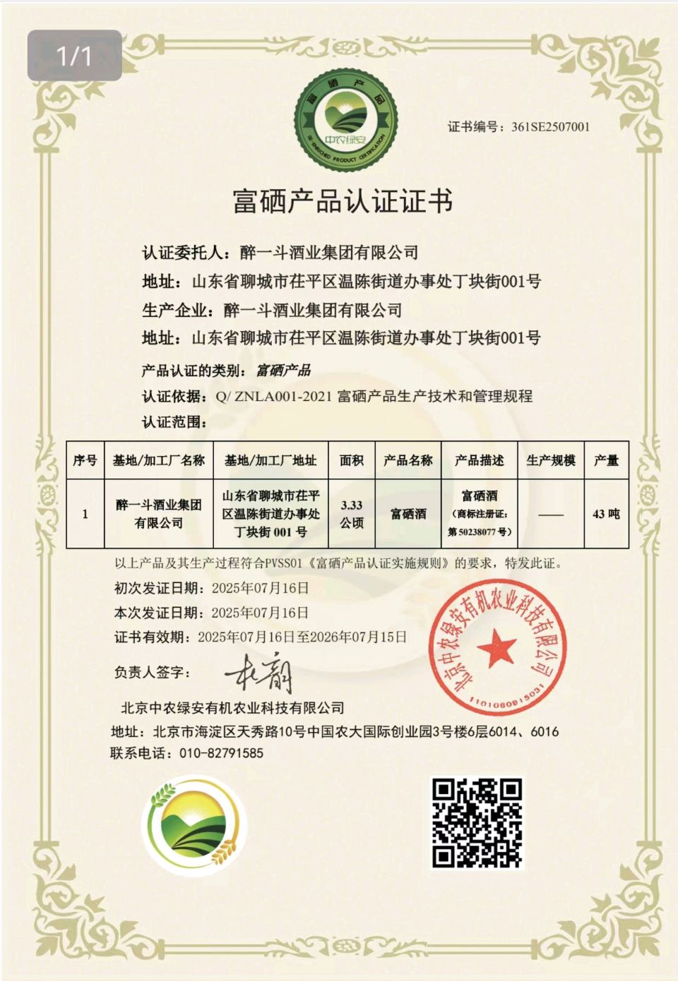 热烈祝贺:醉一斗酒业集团有限公司富硒系列白酒获得“富硒产品认证证书”, 引领健康白酒新标杆