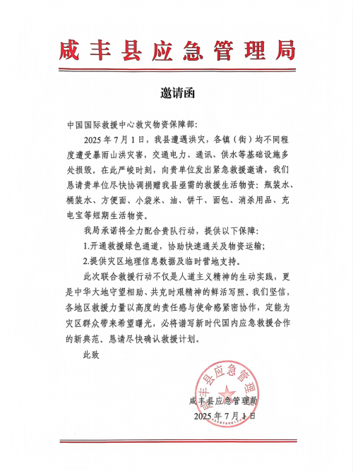 应急管理局致函中国国际救援中心(集团)驰援湖北咸丰县抗洪救灾