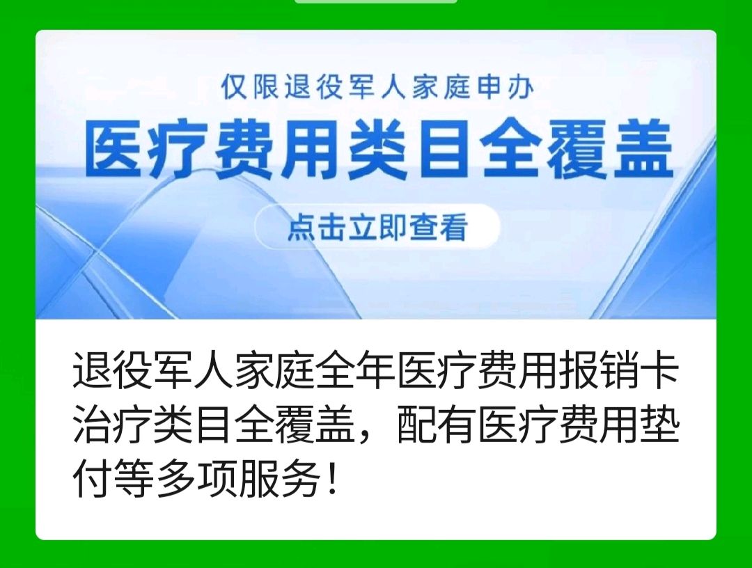 退役军人家庭及家属(配偶、子女、父母、配偶父母)全年医疗费用报销卡治疗类目全覆盖,配有医疗费用垫付等多项服务!
