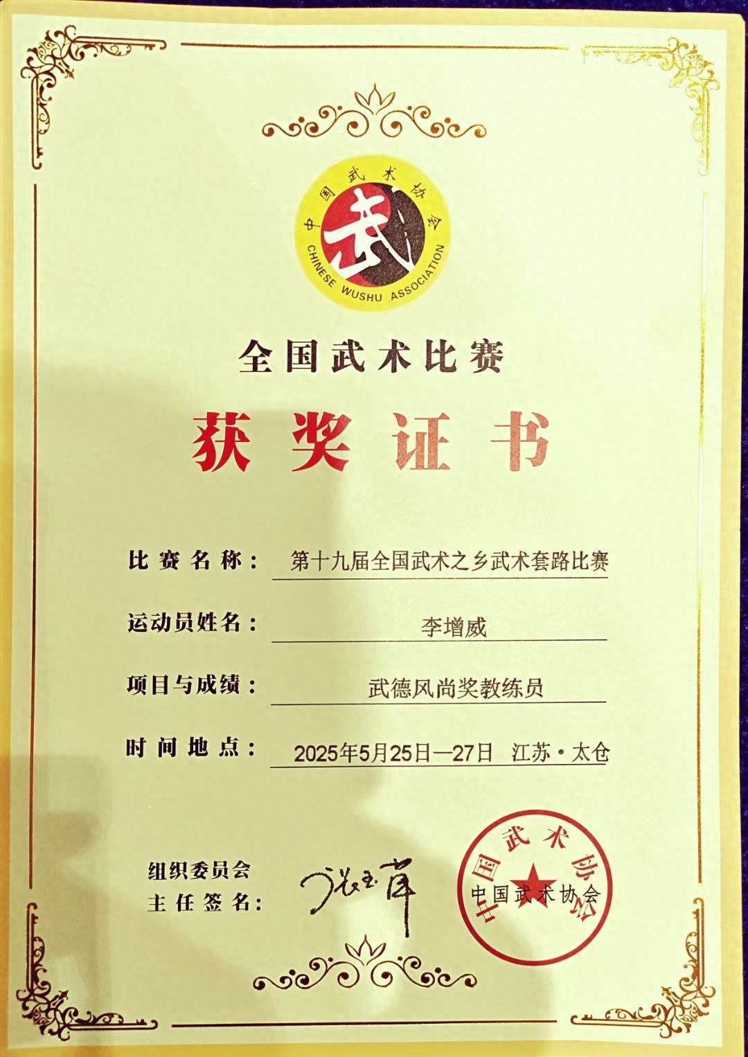 优秀教练李增威,第八次荣获全国武德风尚教练员奖