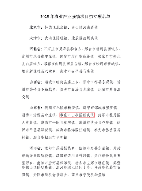 喜报!山亭区城头镇入选2025年国家农业产业强镇项目拟立项名单