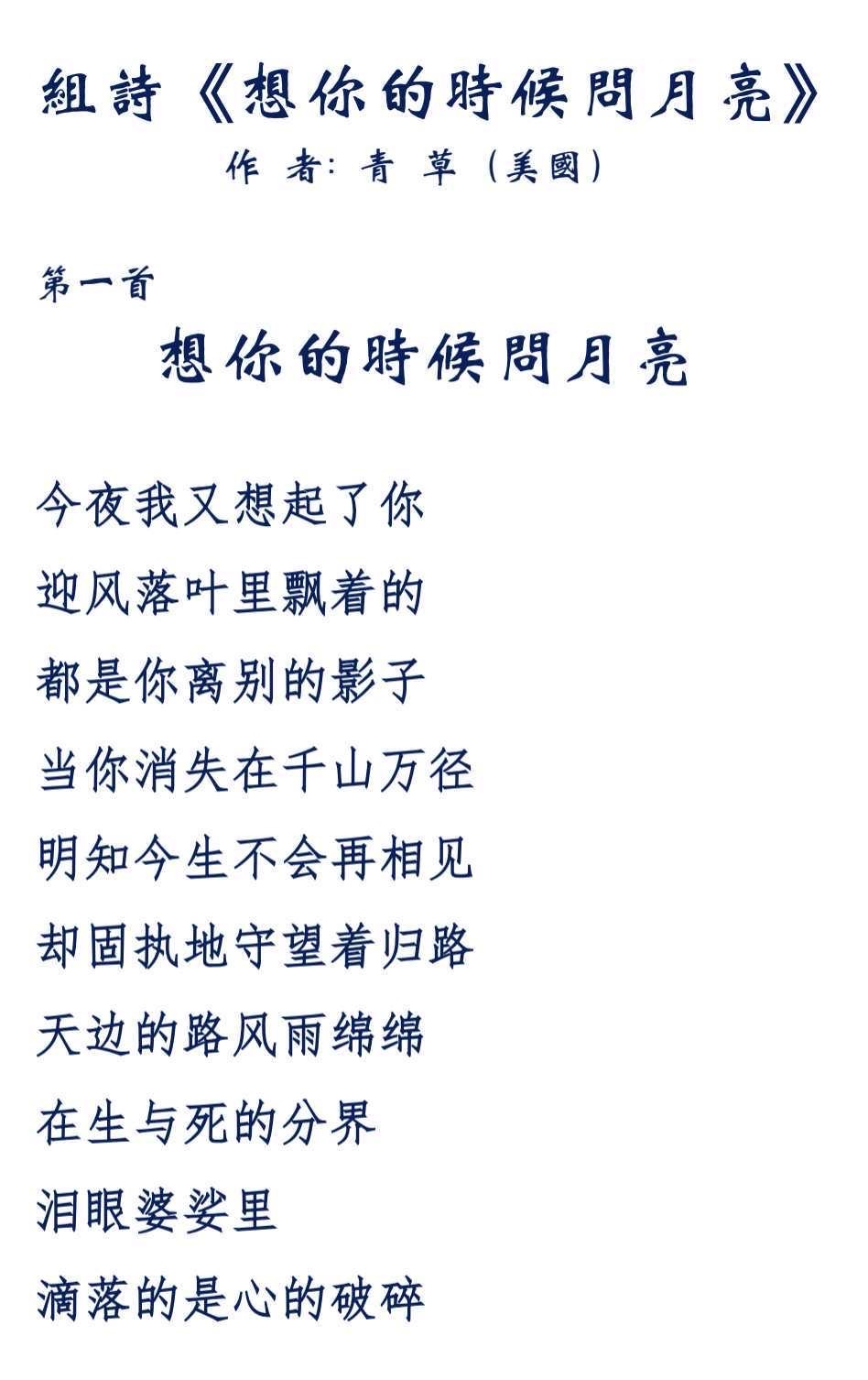 【世界华人文学城】第九期“佳作赏析”组诗《想你的时候问月亮》作者:青草