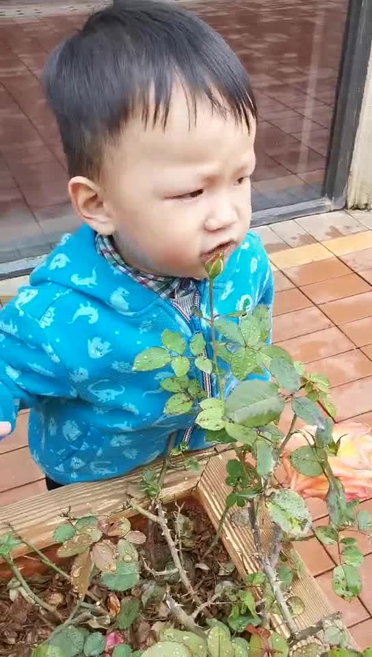 两岁的宝宝竟然把花朵当做话筒,专注的小模样让人耳目一新。。
