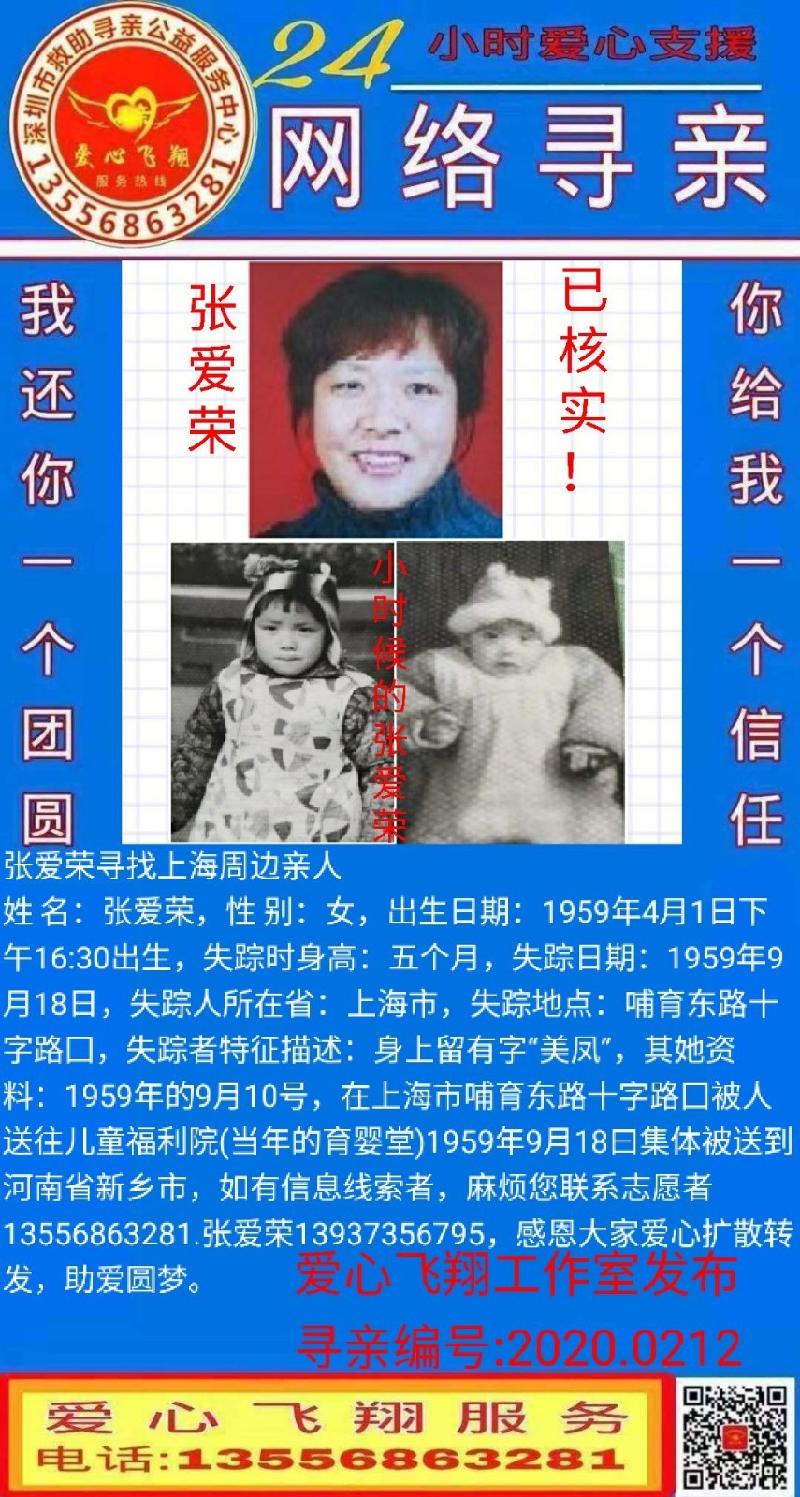张爱荣寻找上海周边亲人姓 名:张爱荣,性 别:女,出生日期:1959年4月1日下午16:30出生,失踪时身高:五个月,失踪日期:1959年9月18日,失踪人所在省:上海市,失踪地点:哺育东路十字路囗,失踪者特征描述:身上留有字“美凤”,其她资料:1959年的9月10号,在上海市哺育东路十字路囗被人送往儿童福利院(当年的育婴堂)1959年9月18曰集体被送到河南省新乡市,如有信息线索者,麻烦您联系志愿者13556863281.张爱荣13937356795,感恩大家爱心扩散转发,助爱圆梦。