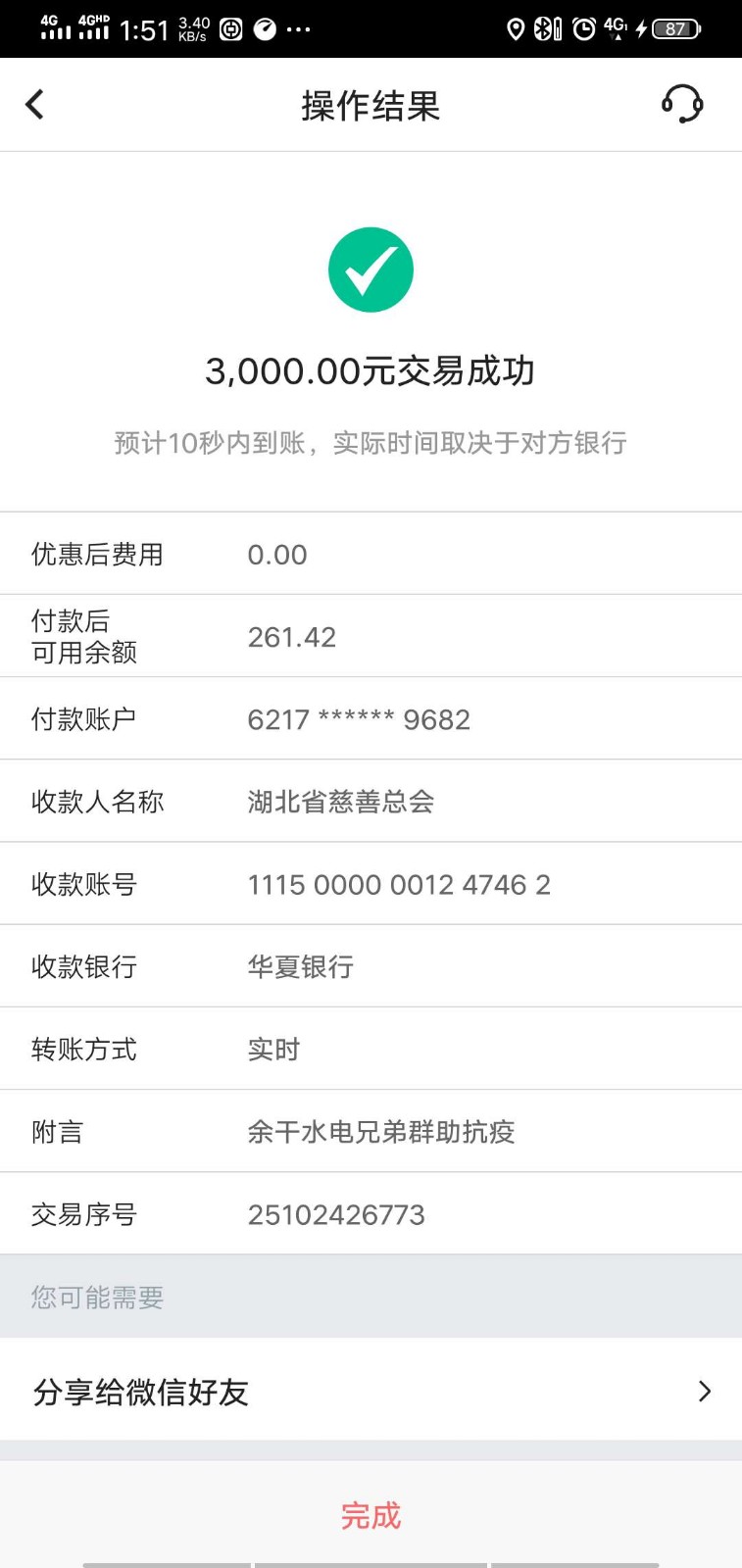 2月8日,由余干水电兄弟群主“蜘蛛侠”、群友何军峰水电安装等心怀爱国热情、爱心善行的网友自发在网络空间发起募捐动员,目前通过水电兄弟群共捐资15000元,分别捐向湖北省慈善总会、鄱阳县慈善会、余干县慈善会三家官方慈善公益机构(每家3000元和余干县爱心联盟协会、余干县蓝天救援队、余干县绿舟应急救援队三家民间公益组织(每家2000元),专项用于支援防控“新冠”疫情工作开展。