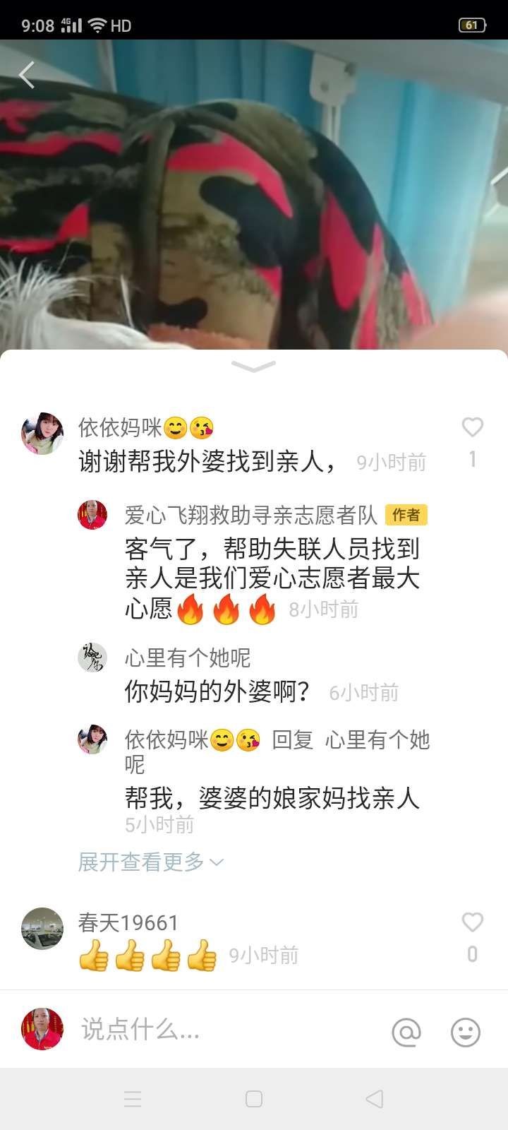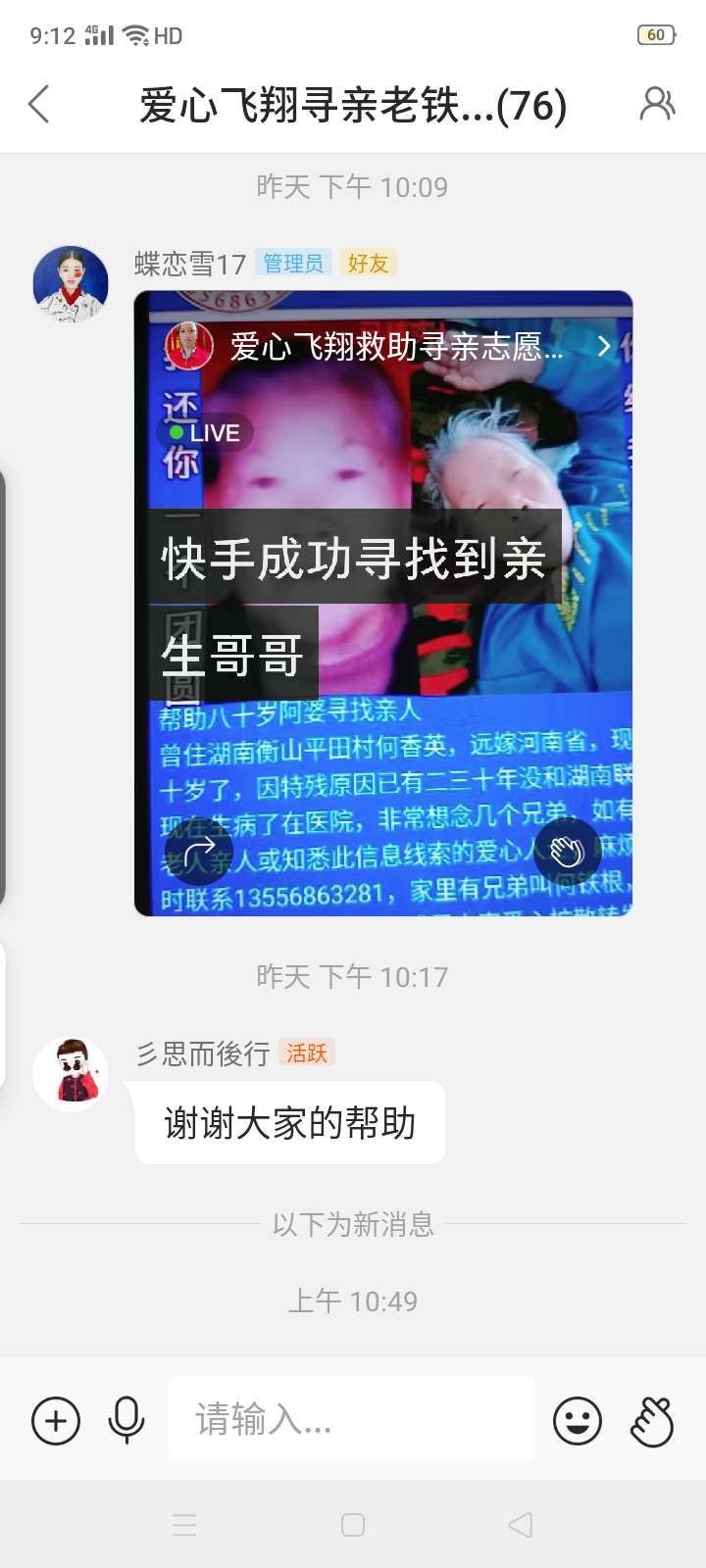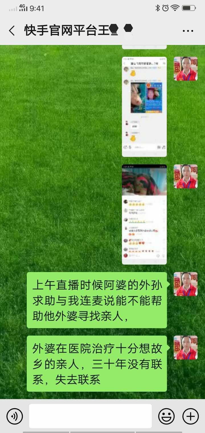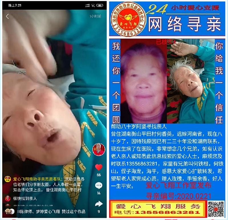 (爱心飞翔负责人易雄):从发快手帮助阿婆寻找家人用了一个小时,成功帮助80岁阿婆找到娘家亲人,运用线上线下各地区伙伴们支持与协助,感恩大家辛苦爱心付出,圆了这位阿婆三十年想见娘家兄弟姐妹们的心 愿。