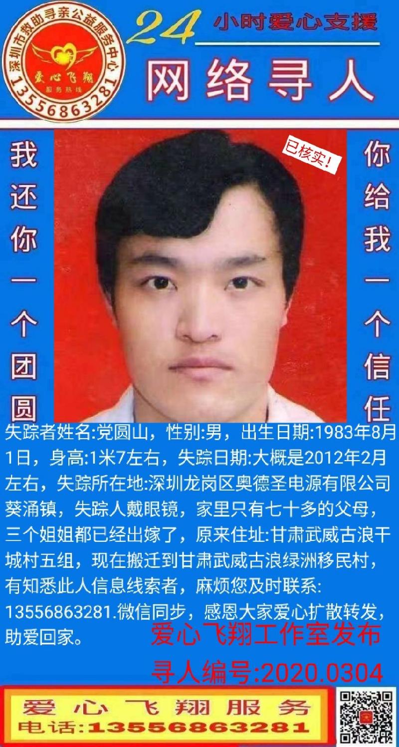 失踪者姓名:党圆山,性别:男,出生日期:1983年8月1日,身高:1米7左右,失踪日期:大概是2012年2月左右,失踪所在地:深圳龙岗区奥德圣电源有限公司葵涌镇,失踪人戴眼镜,家里只有七十多的父母,三个姐姐都已经出嫁了,原来住址:甘肃武威古浪干城村五组,现在搬迁到甘肃武威古浪绿洲移民村,有知悉此人信息线索者,麻烦您及时联系:13556863281.微信同步,感恩大家爱心扩散转发,助爱回家。