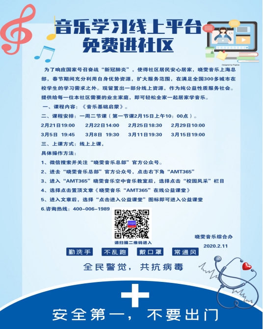 ★ 隔离病毒 不隔离爱 ★根据上图信息关注:“晓雯音乐总部”微信公众号,进入公益课程。二、线下为一线抗战疫情勇士提供一年免费教学 。
