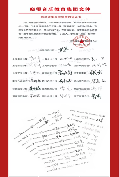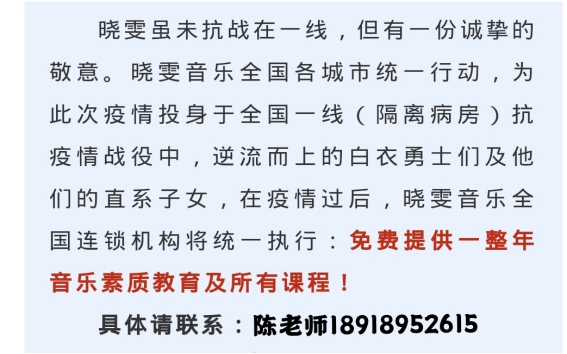 新冠肺炎疫情防控,形势依然颜俊,白衣天使们在疫情的前线不分昼夜的与病毒抗战,我们虽未抗战在一线,但有一份诚挚的敬意。晓雯音乐全国各城市统一行动,为此次疫情投身于全国一线(隔离病房)抗疫情战役中,逆流而上的白衣勇士们及他们的直系子女,在疫情过后,晓雯音乐全国连锁机构将统一执行:免费提供一整年音乐素质教育及所有课程。以及线上的免费公益课程。 只要人人都献出一点爱,世界将变得更美好。