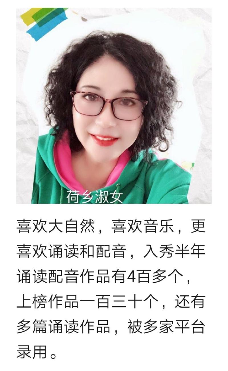 丽华知音,从事播音工作十几年,热爱广泛,喜欢诵读 配音,情感丰富,擅长诵读抒情诗,经典影视大片的配音,为多家平台读过很多优秀作品,代表作品《军装》《梦当兵》《军工赞歌》《槐花潮》《软枣》《故乡》《美丽的白衣天使》《特别的情人节》等,愿我的美声音和满满的正能量,给大家带来开心和快乐!