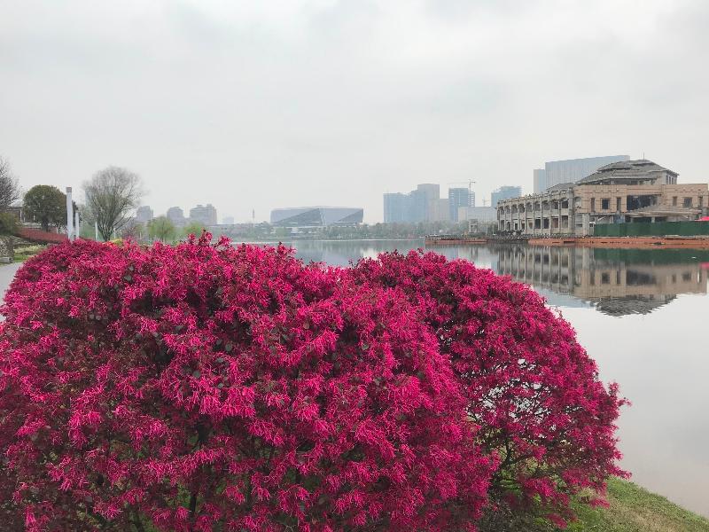 檵木鲜红阳景溢,洞天湖水醉酣春。