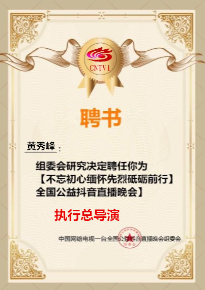 执行总导演 黄秀峰:中央电视台《品牌影响力》节目总制片人,CCTV中国十大民刊《中国草根》·聚力阅读 文学杂志社社长,大型纪实文学《沃土》杂志总编辑。疫情爆发以来,他创作了歌词《中国脊梁》《2020我亲爱的中国》以及中篇小说《沧桑》诗歌《男人的眼泪.献给钟南山》等诗词作品。曾执行总导演【我爱你中国】八方驰援,携手战疫全国公益抖音直播晚会。