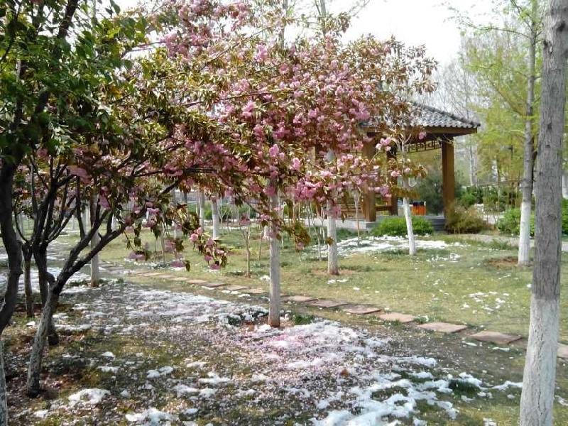 晨曦暖树暮色寒, 四月飘雪伴红嫣;