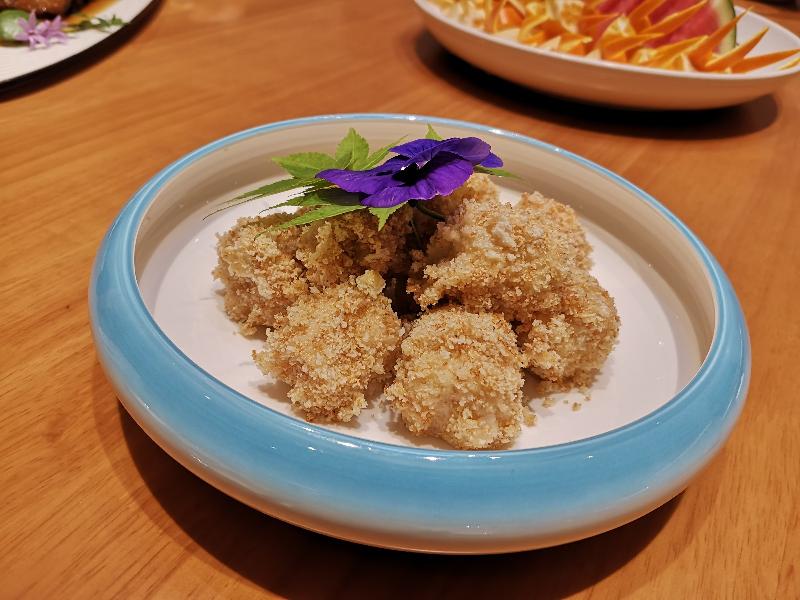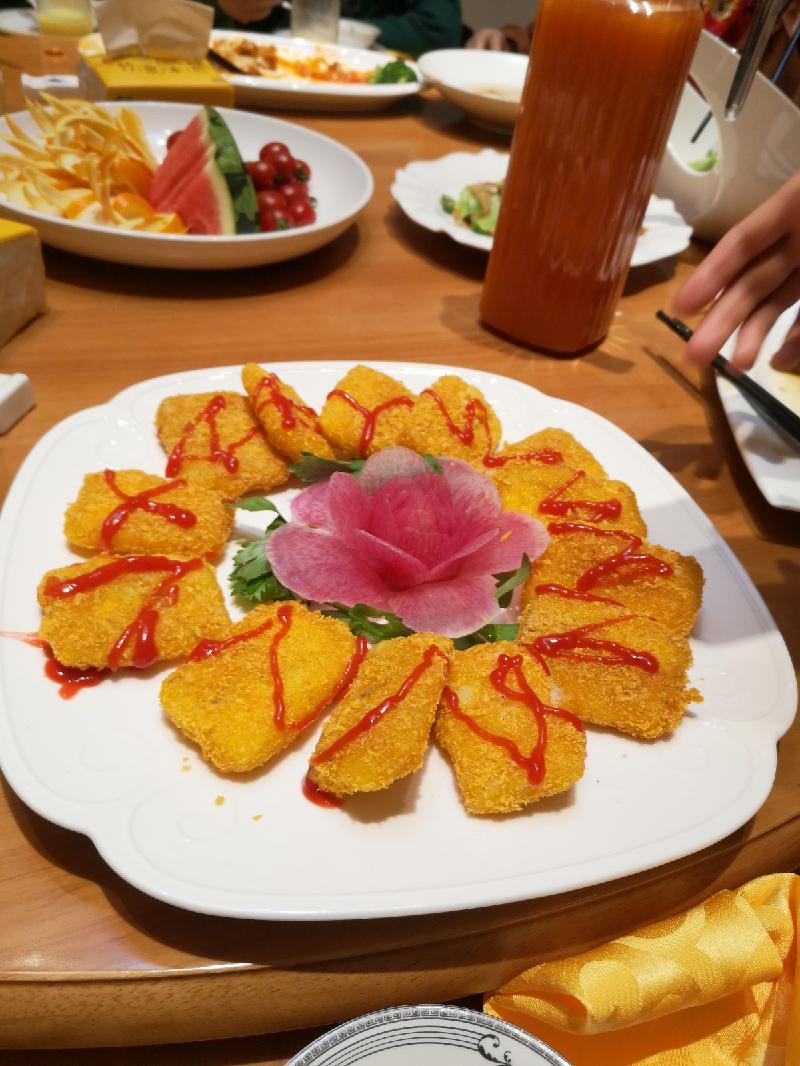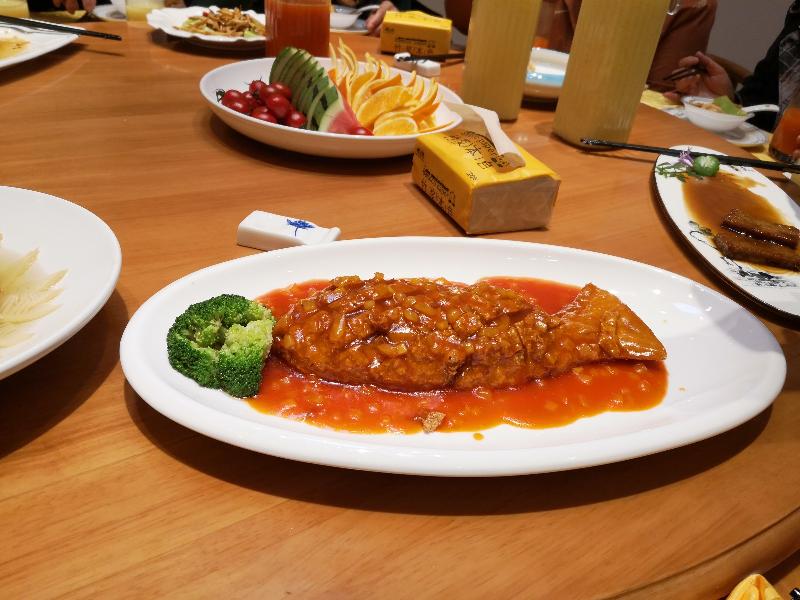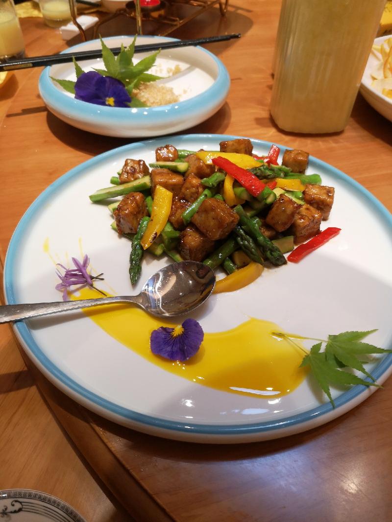 每一样菜都令我们赞叹不已,特别要提的是“蜜汁鲑鱼”和“爆炒牛肉粒”,且不说外观上的以假乱真,即便你吃上一口,你还是不相信这是素食假扮的荤菜。分明一丝一丝,肉质清晰可辨哪!服务员告诉我们:是拉丝植物蛋白制作出来的。哦,原来连营养成份也不输荤菜啊!