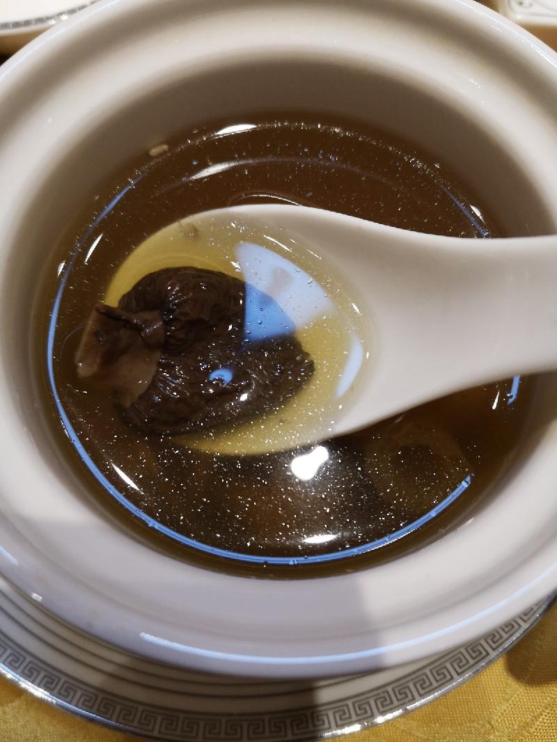 勺子里的请仔细看,坐在我旁边的朋友说,那是羊肚菌,很贵的哦!确实像羊肚,太像了,简直就是个袖珍羊肚!感叹着它奇特有趣的外形,未及细品,已入肚,现在捕捉着一点记忆,只觉口感清新嫩滑,没有香菇和蘑菇那种鲜明的味道,人家名贵得很低调呢。