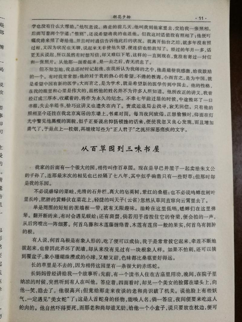 写在照片前:记得初中的语文课本里有这篇文章,那时候并不能十分领会文中的意趣,只记得有一处惹得我忍俊不禁:我疑心这是极好的文章,因为读到这里,他总是微笑起来,而且将头仰起,摇着,向后面拗过去,拗过去。读到这里,书孰先生那自我陶醉的情景和幼小的鲁迅先生的揣测形成一种强烈的幽默效果,于是反复读,反复笑。还有一处也留下极其深刻的印象:不必说…不必说…也不必说…单是…当时老师在课堂上对我们讲这样写法的极妙,虽说不必说,却已说了。我当时也深觉其巧妙,以至于后来常用这种方法来写作文。 如今,几十年过去了,再读这篇文章,发现文字中又生出更多的意趣来。到底是名家作品,历经岁月的沉淀,越发显示出光芒来,像一尊上等的玉器,经得起时间的打磨。
